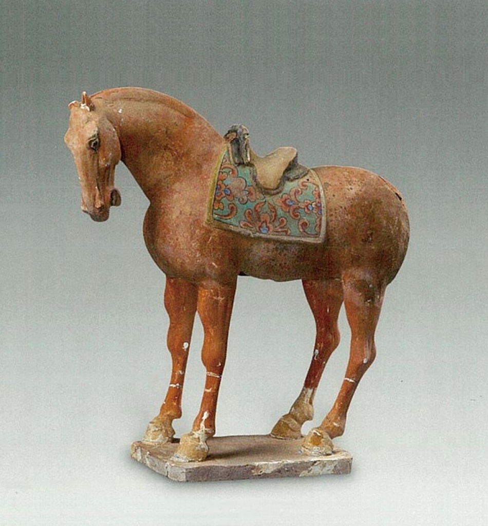 8.馬俑修復2件,此選介1件。標本4413(圖24),紅馬身形、尺寸完全同女騎俑之馬,鞍、韉形制亦同女騎俑鞍、韉,但鞍面未塗彩,似表明鞍面被馱物完全佔據,且不影響韉的觀瞻,綠緣藍韉上用黑、粉紅、紅、藍四彩繪出三朵忍冬紋。高38公分。我們推測這種馬為馱物馬。