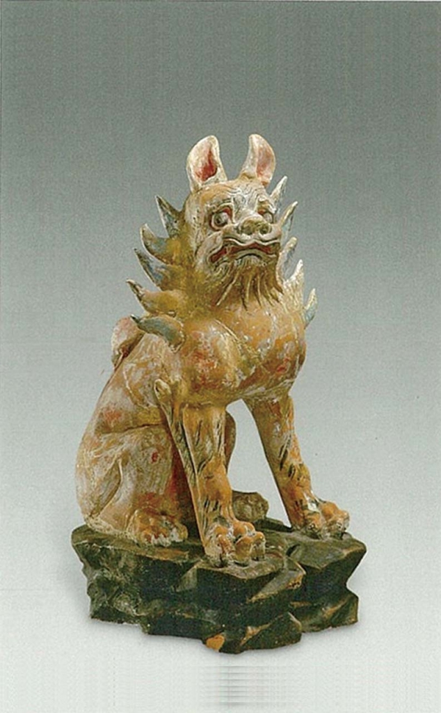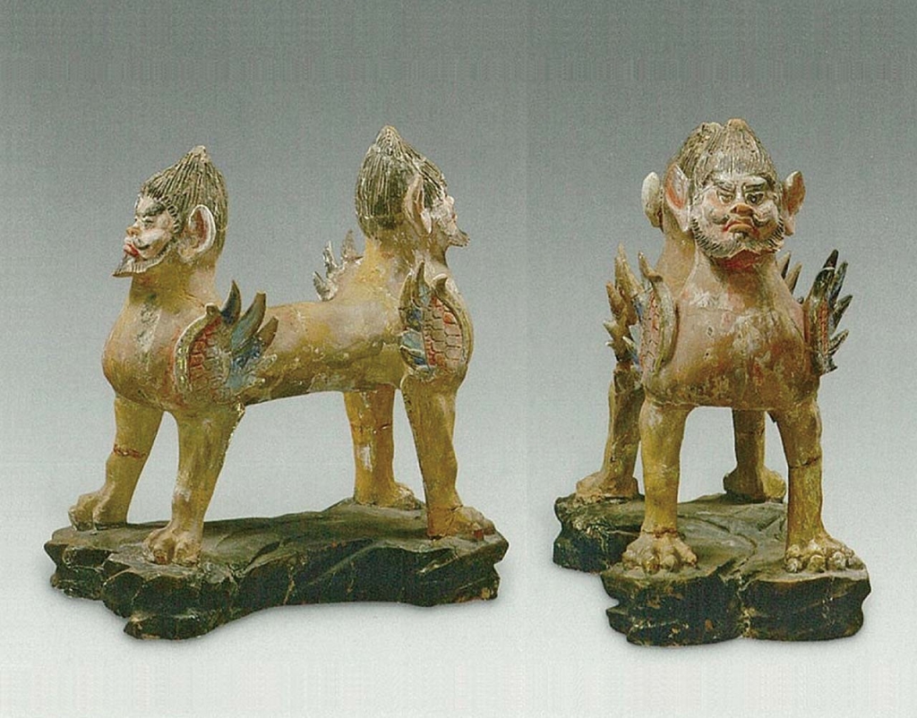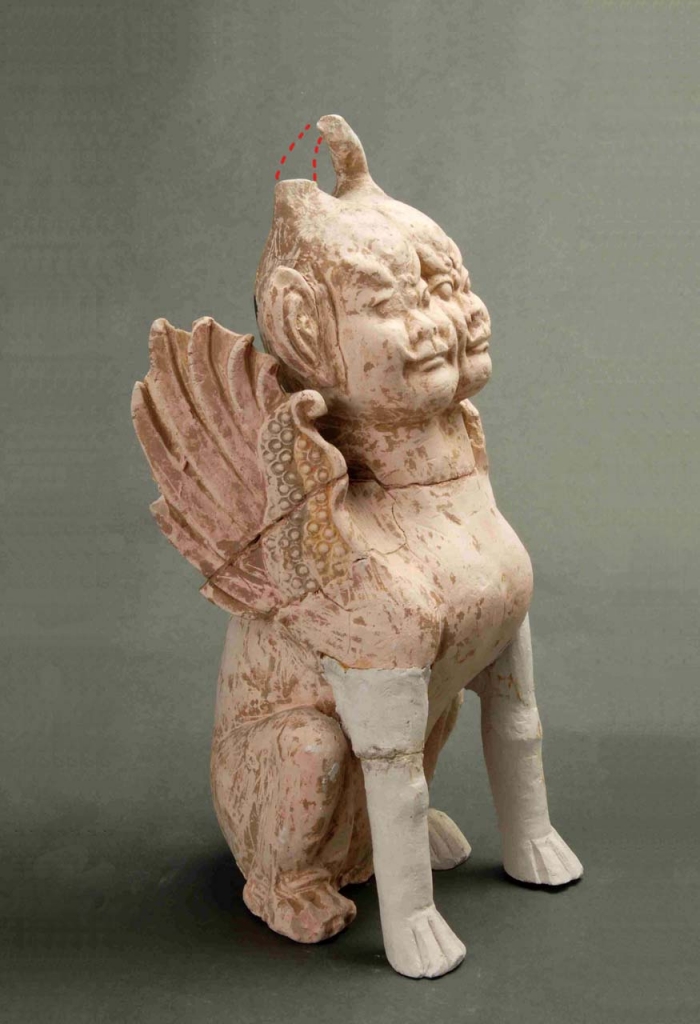 1.鎮墓獸2件。標本4352(圖3),雙人首鎮墓獸。人首各居一端,頭相背,共用一身,呈橫柱狀,四前肢立於岩座上。髮梳頂部成尖狀,條狀眉凸起,眼角斜吊,鼻樑較凹,鼻尖翹起,高顴骨,寬嘴緊抿,嘴上有八字鬚,嘴下絡腮鬍上接大耳,胸部凸起,肩部生出兩羽翼,前肢粗壯,虎爪有力。獸身大部分塗有白彩,脫落嚴重,髮、眉、鬚塗黑彩,耳、唇塗紅彩,翼長羽塗藍彩,短羽塗紅彩,緣貼金。高52公分,長47.8公分。標本4351(圖4),獸首鎮墓獸。頭頂兩耳朝前,寬額頭,圓眼凹陷,寬鼻翼高翹,闊嘴微張,露出獠牙,頜下八縷鬍鬚,頸至肩飾十縷短鬣,脊鬣更短,呈齒狀,板狀尾貼於背部,上接短齒,胸肌發達,前肢斜伸,後肢曲蹲於岩座上。獸通體塗白彩,復在白彩上施彩,耳、嘴、胸、腹塗紅彩,鬍、鬣塗藍彩,腿毛塗黑彩。高56.6公分。