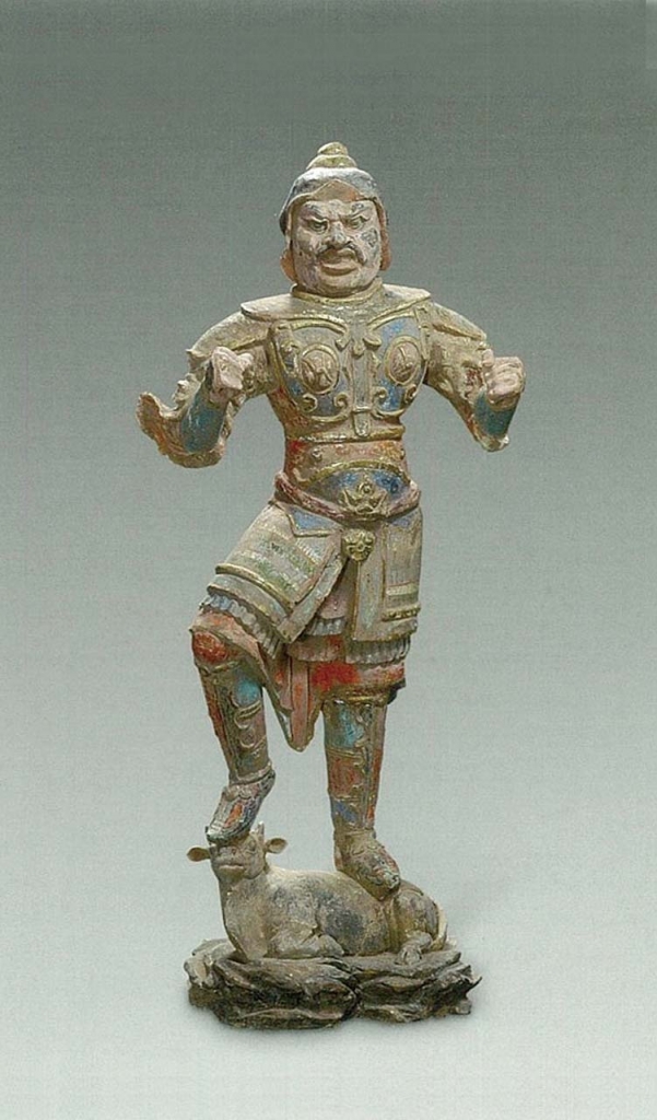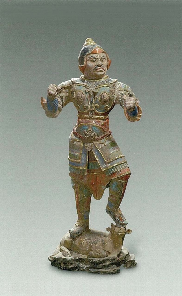 2.武士俑2件。標本4353(圖5),頭戴寶頂盔,盔沿三處翻起,濃眉,大眼,蒜頭鼻,寬嘴厚唇,上有八字鬚,肩披龍首披膊,著雲口套袖、閉口式臂褠,甲身繫滕蛇、索帶,胸護圓形,腹護為獸面,下有短蔽膝,甲身下擺露出襯裙,腿著膝褲,足著靴,雙手握拳半舉,拳中空,左腳踏牛頭,右腳踩牛臀,目視左前方,一臉威嚴相。牛昂首向左,小耳,雙角,抿嘴,短頸肥身,四肢曲臥於低岩座上。俑飾彩非常繁複,臉先塗淡紅彩,然後黑彩描眉眼、鬍鬚,紅彩塗唇,盔頂、甲衣、膝褲的邊棱貼金,盔、臂褠、甲衣胸腹部、膝褲大部施藍彩,甲片塗綠、白、紅、藍四彩,盔沿、套袖、甲衣腰部、襯裙塗紅彩,岩座塗黑彩。通高89公分。標本4354(圖6),容貌、服飾大致同前,唯臉稍長,張嘴,雙手握拳半舉,右腳踏牛頭,左腳踩牛臀,目視正前方,面容稍活潑。牛形象同前,昂首向右,四肢曲臥於低岩座上。俑的飾彩完全同前。通高89公分。