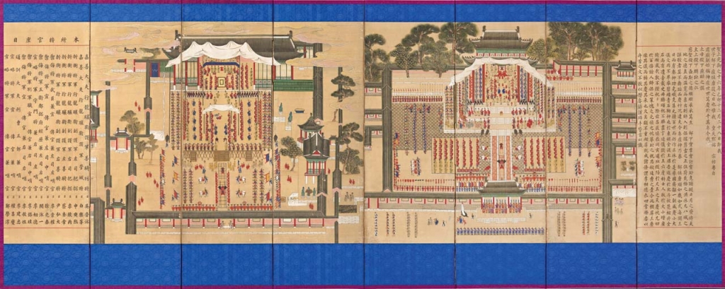 19世紀宮中行事圖主題圍繞在慶祝誕辰或登基日的王室宴享。繪畫主題受到諸多限制,但對王室宴會的描繪不僅華麗,製作規模也日趨擴大。最具代表性的事件是1879年為了祝賀王世子(純宗,1907-1910在位)從天花中康復而舉行的慶典。為了此次盛典,共製作27幅屏風呈獻給王室,是朝鮮王朝歷來最大規模的屏風繪製企劃,以〈王世子痘候平復陳賀圖〉(圖3)為代表。(註9)籌辦慶典的官署從地方官廳收取「屏債」稅,用以支付造價不菲的屏風開銷。然而王室宴享的屏風製作發展至後期,王室與官員不斷地追求打造繁複精緻的宮中契屏,卻將財政負擔轉嫁到地方政府與百姓身上。