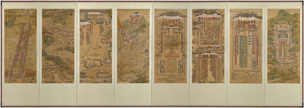 〈華城陵幸圖〉(圖2)為正祖涉足宮中繪畫製作的案例中,規模最壯觀的八扇屏風畫。上文所提及的早期紀錄作品,主要為官員間相互贈送的繪畫,而〈華城陵幸圖〉為正祖積極參與繪製,並有賞賜臣民意義的屏風畫,兩者的目的差距甚遠。〈華城陵幸圖〉中八扇屏風分別描繪正祖前往華城的不同場景:(一)華城聖廟展拜圖、(二)南軒放榜圖、(三)奉壽堂進饌圖、(四)洛南軒養老圖、(五)西將臺夜操圖、(六)得中亭御射圖、(七)還御行列圖、(八)漢江舟橋還御圖。這八扇屏風並不僅擁有記錄特殊活動的功能,且被記錄下的每個事件更傳達著以儒治國的理念,如孝悌具現、文武振興以及萬民和親等的理想狀態。