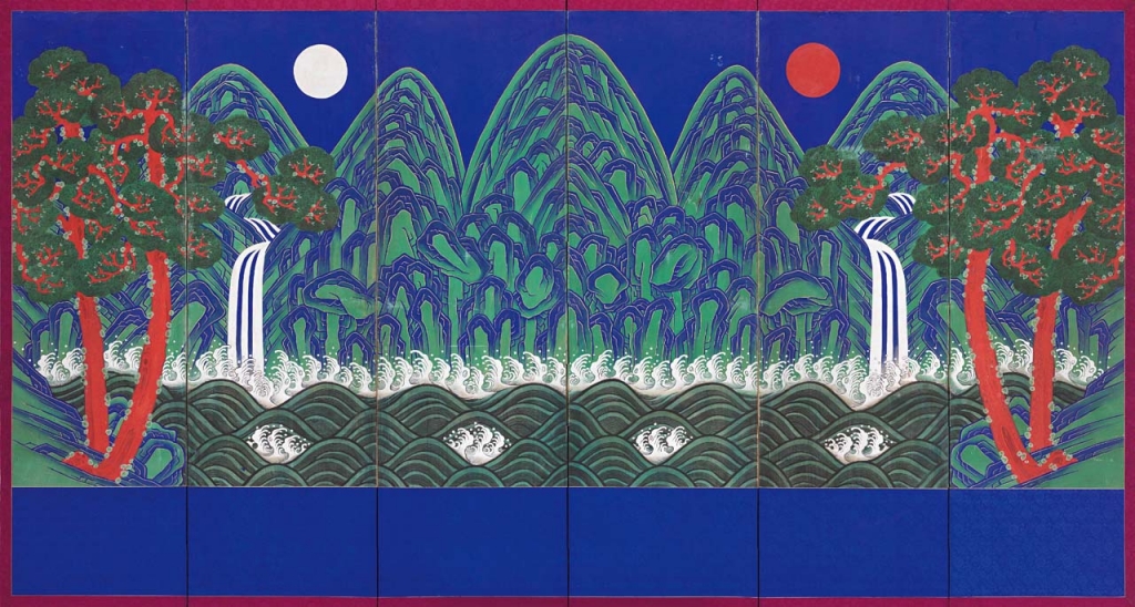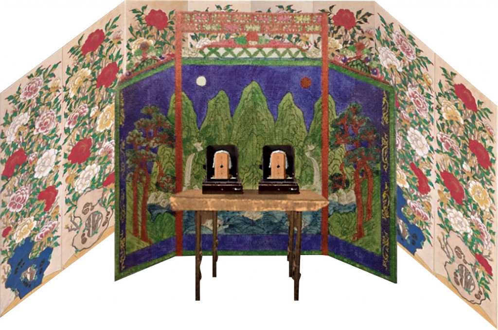 〈日月五峰圖〉被視為象徵國王權力的代表性屏風,圖上包含五種元素,即日、月、五峰、水波以及赤松。此五種元素在東亞文化裡,均為表達永生與長壽的常見符號。然而「日月五峰圖」這五種特定圖像的組合,為朝鮮宮中創造出來的獨特圖示。一些學者試圖以陰陽五行說來解釋此圖示的起源,而另一些學者則是認為其源自《詩經》中〈天保九如〉的九樣吉祥符號。儘管目前日月五峰圖的起源仍有不少爭議,但圖中帶有的象徵意義與作用是毋庸置疑的。日月與五峰代表陰陽五行世界的重現,換言之便為天與地的對照,國王可以藉由坐在王權屏風前,宣稱自己是天地間唯一的合法統治者。「日月五峰圖」作為權力象徵,並不只放置於御座後方,同時也陳設於代表國王的御眞或神主周遭。根據不同的地點與情形,日月五峰圖會製作成各種形式,例如正殿與偏殿御座後方採用中大型屏風製作而成,寢殿裡則是貼於牆壁與門板上。通常這些屏風都有一固定格式,由懸掛國王肖像的插屏,以及為神主締造出儀式空間的三扇屏所組成。因此,不能將日月五峰圖單純視為獨立繪畫或裝飾家具,其更重要的功能是成為國王建築與儀式空間的一部分。