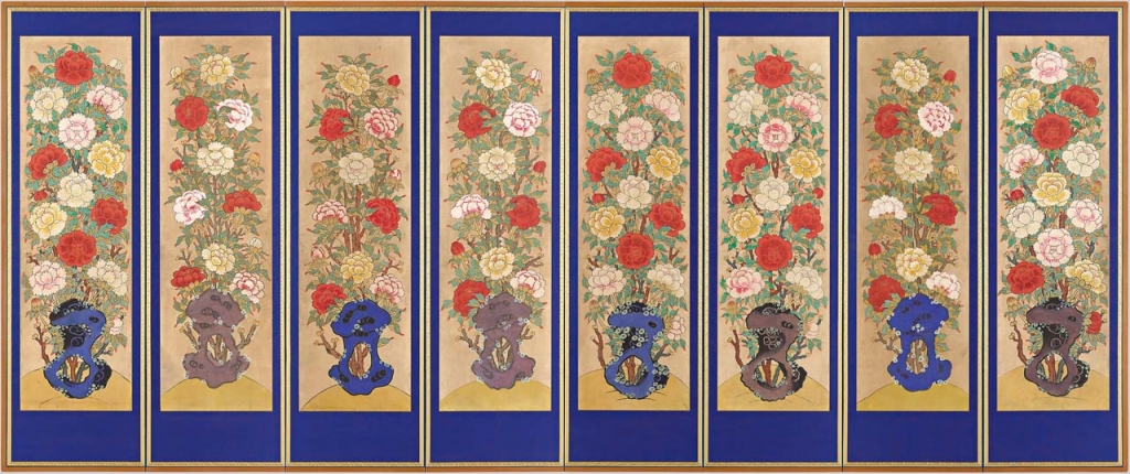 花鳥畫在宮中普遍地被使用在裝飾性的屏風畫上,其中牡丹因象徵「百花之王」成為最受青睞的題材。牡丹圖被廣泛地使用在代表王后、世子與其他王室成員身上,而日月五峰圖則限定只有國王才能使用。牡丹圖同時也是最為常見的屏風畫,多用於為婚禮、宴會與葬禮營造神聖的儀式空間。〈日月五峰圖〉於國王薨逝後被置於神主正後方,〈牡丹圖〉則環繞擺放於〈日月五峰圖〉周圍。(圖6)在日月五峰圖作為國王本身的象徵時,牡丹圖的功用為保護國王王座,並將儀式空間神聖化。基於此原因,牡丹圖屏風一般高逾兩公尺,寬逾四公尺,以完整佔據聖廟的空間,且繪畫風格採用較垂直且僵硬的線條以強調儀式的莊嚴性。