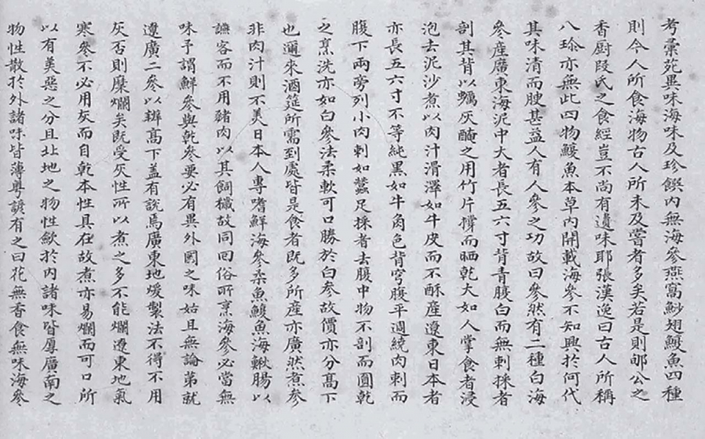 與河豚相似,海藻、珊瑚、海參同樣是海物中的珍品。聶璜在書寫〈海參〉一章時,描繪同樣周詳。他特舉範例,指出海參有兩種,一種為白海參,「產於廣東海泥中,採者剖其背,以蠣灰醃之,用竹片撐而晒乾,大如人掌」。食用之前,要先將其「浸泡而去其泥沙」,然後「煮以肉汁」,則「滑澤如牛皮而不酥」。至於另一種海參,主要產於遼東一帶,「長五六寸不等」。按聶璜的記載,採這種遼參者,大多先去海參的「腹中物」,但卻「不剖而圓乾之」,相信是希望有效保留其鮮味之故。烹調的方法大概與炮製白參的類同;不過若論兩者的口感與「柔軟度」,遼參則較白參略高一籌,所以其「價值亦有高下之分」。