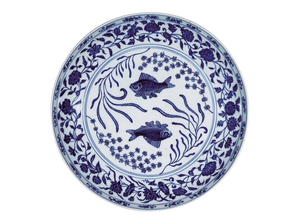 青花燒造於中國元代後期江西省的景德鎮窯,到了明代,景德鎮窯成為朝廷直接管轄的官窯。而景德鎮民窯和中國南方的窯場,也根據包括日本在內等海外接收地的需求和喜好,燒造外銷用的瓷器,積極從事輸出。本館藏有一件景德鎮窯燒製〈青花雙魚紋大皿〉(圖1),大皿的紋樣繪於微微泛青的透明釉下,色調深青,發色鮮明。水藻間優游的雙魚,上下對稱,周圍環繞著由牡丹、蓮花、菊花、山茶等四季花卉所串起的唐草紋。「魚」,字音通「餘」,是被視為財富象徵的吉祥圖案。四季相繫,則當是祈願一年四季皆富足的紋樣吧。將蓮池與水藻描繪在一起的魚藻紋,據信是受到當時流行於江南地區之繪畫的影響。