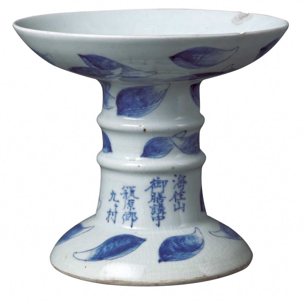 同時,鹿背山燒也藉由汲取中國陶瓷紋樣和技法,誕生出獨樹一格的獨創設計。器皿種類多為食器和茶器,如海住山寺流傳下來的〈染付蓮花紋高杯〉(圖11),即是為當地社寺所燒造的日常用器。這件京都海住山寺流傳下來的高杯,為大小不同的五個杯子之一。染付的蓮瓣四散,表現出散花。內底工整地寫上「鹿背山製」字樣。由杯身支柱側面的銘文可以推知,此杯原為供奉佛前供物用的鹿背山燒供品臺,由瓶原當地村裡的御膳講中(註:一種地區性的互助組織)奉獻給海住山寺。瓶原位於木津川北側,為奈良時代聖武天皇設置恭仁京的所在地。