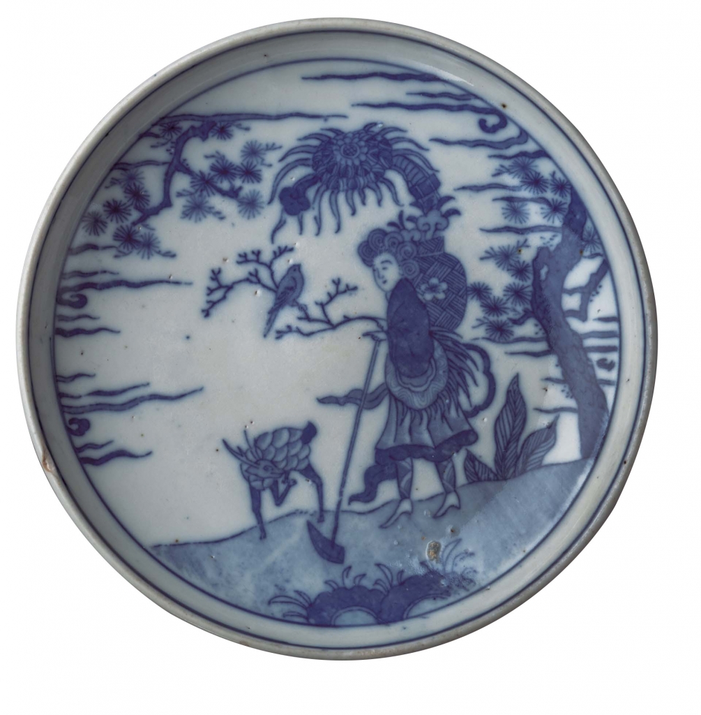 展品〈銅版繪付仙姑圖皿〉(圖12)是以「銅版繪付」表現紋樣的盤子。銅版繪付,是一種使用顏料進行銅版印刷,將圖像摹寫到器物表面的技法。儘管其線與面的色調顯得均勻,卻能製作出相同的紋樣,在日本主要流行於江戶時代後期。鹿背山燒的銅版繪付,多見於盤、鉢、碗等,既有表現松竹梅紋或如本件作品上的仙姑與鹿之圖案,也有圖案翻轉、或內底置有「專製有權」銘款的作品。仙姑赤腳,腰間纏繞葉片,揹著裝有靈芝的壺狀籃子,手持長柄棍棒和鳥兒停歇的樹枝,站在屋外。這位女仙,很可能是葛洪《神仙傳》等文獻所記載的「麻姑」,或出現在《列仙傳》卷下等文獻中的「毛女」。據說,麻姑在西王母生日時,獻上以靈芝釀造的酒以祝賀其長壽;毛女則是一位宮女,於秦朝滅亡後遁入深山,成為長生不老之身。兩人都呈赤足行走在山間的姿態,與具有不老長壽意味的靈芝、鹿、松樹等一同出現。這類以女仙為題材的圖案,可見於日本所謂「吳須赤繪」一類於明末漳州窯所燒造的五彩瓷器,鹿背山燒或許便是基於這類圖案來進行製作。此既是具有長壽意涵的吉祥畫題,選擇鹿的圖案,或許也跟鹿背山的地名有關吧。前文所介紹〈吹墨手鹿櫻紅葉紋鉢〉(見圖8)和此件〈銅版繪付仙姑圖皿〉等作品上所見到的似與鹿背山有關的鹿紋,可以感受到製作者對於鹿背山燒的自豪感。