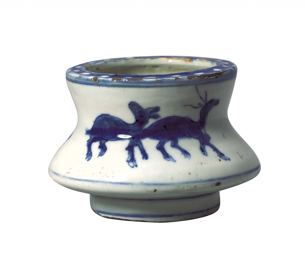 明末天啟年間(1621-1627)於景德鎮民窯燒造並銷往日本、為茶人所喜愛的青花,在日本被稱為「古染付」。「古染付」多是在稍顯粗放的式樣上描繪出大大的紋樣,而口沿處因釉料爆裂所產生的「蟲蝕」(釉剝)現象,亦為其特徵。本次展出一件古染付〈青花鹿紋香爐〉(圖2),器腹呈大幅度折曲,於側面描繪出姿態閒散的五頭雌雄鹿。厚實圓渾、富重量感的器皿,予人溫暖的感受,彎曲的器形,則為鹿群賦予了空間深度和動態感。