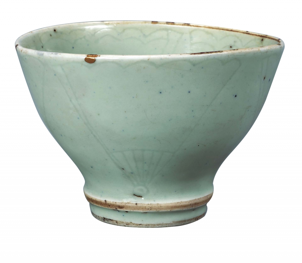 另有一種約略於同時期由景德鎮燒製並銷往日本、於深藍色青花上施罩亮澤透明釉的瓷器,因作品中曾見「五良大甫吳祥瑞造」銘款,故在日本被稱作「祥瑞」。祥瑞以結合幾何圖案與花鳥、山水紋樣之設計為特色,亦多見書有吉祥意味之文字或詩歌者。相較於古染付,祥瑞燒造品質較好,青花發色深藍,幾乎未見蟲蝕現象;且祥瑞雖多以色澤鮮豔的青花來描繪紋樣,但也有施加釉上彩的五彩和青瓷等,裝飾技法較古染付更為豐富多彩。本次展出一件祥瑞作品〈青瓷刻花扇紋碗〉(圖3),此碗之器身內外各以線條刻出四把展開的扇子,並施罩青瓷釉。