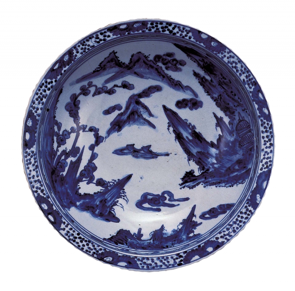 日本瓷器之燒造,是以自朝鮮半島傳入的燒造技術為基礎,並以中國景德鎮窯所燒製的青花為原型,於1610年代在以佐賀縣有田町為中心的肥前地區開始燒造。這類在近乎透明的白地上襯以鮮明藍色紋樣的青花瓷器,在日本被稱為「染付」,衍生出各式各樣的作品。本次展出一件重要文化財〈染付山水紋大皿〉(圖4),是有田地區瓷器生產初期的「初期伊萬里」代表作。大皿呈半球形,頗具深度,相對於此,圈足則顯得較小。中國風的山水圖紋樣,也許是因為畫在曲度較大的器表上,越靠近畫面邊緣,山脈越是被大幅地拉長,梅樹也被描繪得較大。發色鮮豔的深藍色和富有氣勢的強烈筆觸,相當具有可看性。
