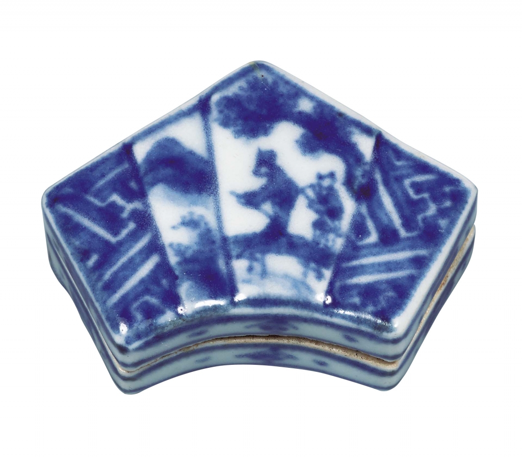 江戶時代後期,隨著京都地區開始燒製瓷器,中國的青花也受到當地陶工們積極地仿製。在京都,青木木米(1767-1833)很早就以仿製中國陶瓷聞名,留下了煎茶用具等符合當時流行的巧妙作品。永樂保全(1795-1854)也是活躍於京都的陶工,除了青花,還製作出許多仿中國南方出產之交趾燒、華南三彩等中國陶瓷的複製品,以及從中得到啟發的作品,並製作出精巧的祥瑞複製品。眾所周知,永樂保全也在各地開窯和製陶,據說他曾在天保年間(1831-1845)造訪鹿背山,在當地開窯,從事陶器製作。展品〈祥瑞寫染付結文形根付〉(圖5),是一件仿祥瑞的根付(譯註:一種裝飾用的墜子),模擬摺起之書信造型,即是永樂保全在現今滋賀縣大津市開窯時所燒製的作品。蓋上的圖案,由松樹下渡橋的人物圖和由卍字所接起的幾何紋樣組成。白地上襯以色澤鮮豔的藍色,對比鮮明。