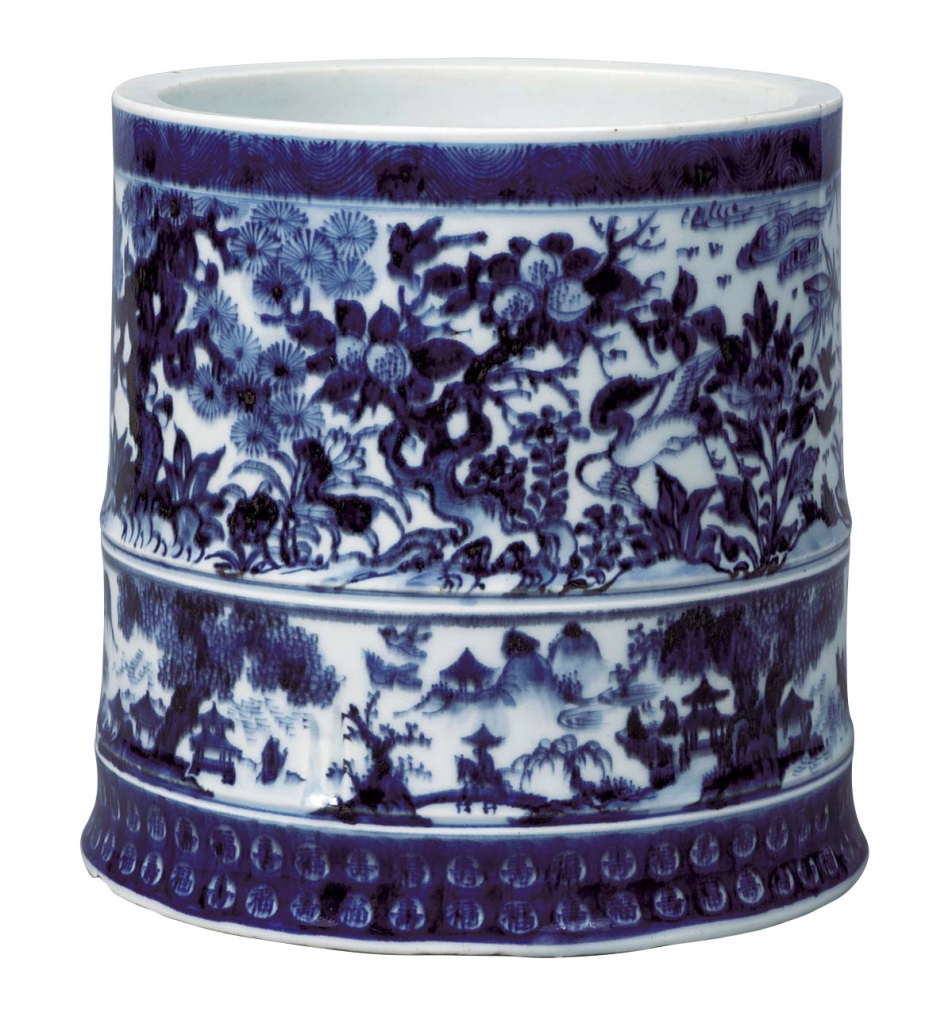 於白地上襯以鮮明藍色紋樣的中國青花瓷器,深受世界各地喜愛,除了用於外銷,也在製陶和文化上產生很大的影響。日本也不例外。江戶時代初期,先是誕生出以青花為原型的染付瓷器,到了江戶時代後期,京都地區也開始燒製瓷器或中國陶瓷的複製品。所謂「鹿背山燒」,正是仿造中國明清時期的青花,燒造出繪有精美紋樣的高品質瓷器。例如本館所收藏的一件〈染付山水文水指〉(見下文圖7),以鮮明的色彩表現出富有特色的紋樣,看似是來自景德鎮的「祥瑞」作品,實際上是在京都鹿背山燒成的日本製瓷器。
