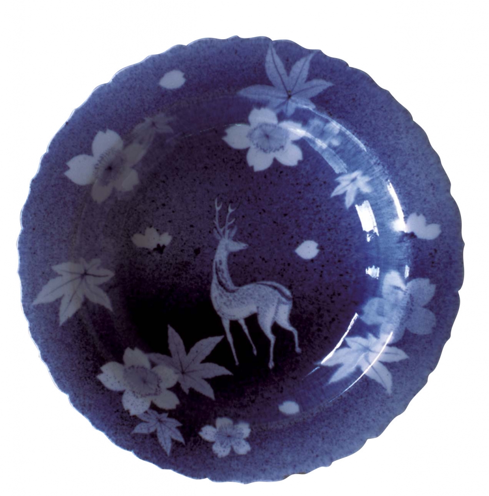 另一件雲洞窯的作品〈吹墨手鹿櫻紅葉紋鉢〉(圖8),稜花形的口緣拓寬了視野,其上繪有鹿、櫻花、紅葉等夢幻般的紋樣。紋樣之描繪,並不使用輪廓線,而採用了在紋樣上疊加紙型再吹灑顏料的吹墨技法。如櫻花和紅葉著以淡淡的顏色,即是透過多次的噴灑,表現出濃淡色調。吹墨,是在中國明末的古染付以及受其影響的有田所施用的技法。本件作品有著細膩的描繪和背對背的鹿紋,可謂鹿背山燒的代表作之一。