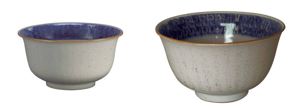 鹿背山燒燒製於產出優質陶土的鹿背山,為滿足當時對中國陶瓷的需求,主要是採用中國陶瓷中的「祥瑞」為範本,也仿製了古染付及中國南方的漳州窯產品,或者是陰刻〈赤壁賦〉文字的刻字鉢等清代瓷器,可說是廣泛擇取了當時所能見到的各式瓷器。例如來自景德鎮的〈赤壁賦刻字鉢〉(圖9),於白地上施加淺陰刻的〈前赤壁賦〉文字,排列有序,具有清雅的韻味,和以青花寫就的文字大異其趣。此鉢呈器腹圓鼓、口緣略外撇之造型,樣式精巧。隨附的箱子上,有「前赤壁賦彫附 新渡南京燒鉢」墨書,據此可知它在很早時就被帶到日本。而鹿背山燒〈赤壁賦刻字鉢〉(圖10)染付僅僅施加在鉢的內面,內底中央書有「永樂年製」偽托銘款。側面陰刻的草書文字「赤壁賦」、「壬戌之秋七月……」,乃北宋蘇軾〈前赤壁賦〉,描寫傍晚起在長江上乘船遊覽赤鼻山(湖北省黃岡縣)時的遊覽情景,以及享受自然之美的喜悅和感動。本件作品與景德鎮〈赤壁賦刻字鉢〉有著相同的造型,甚至圈足的形狀也都細膩地模仿所謂「新渡」的清代瓷器(註:新渡與室町時代傳入的古渡相對,乃用以指稱江戶時代由中國傳入的作品)。而偽托的銘款與紋樣,亦可能同樣作為中國瓷器的要素,而被一併複製下來。