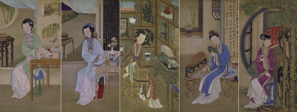 圖1 (左起)清《雍親王題書堂深居圖屏》12幅之〈撫書低吟〉、〈持表對菊〉、〈博古幽思〉、〈裘裝對鏡〉、〈桐蔭品茶〉,絹本設色,各184×98公分,北京故宮博物院藏。圖/劉曉晨。