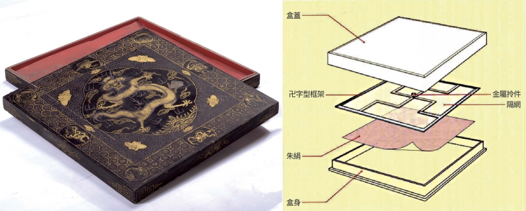 瀋陽故宮館藏30餘件斗方盒,均為正方形。斗方漆盒長62.5公分、寬為73.5公分,內盛朱絹斗方,長57公分、寬65公分,個別外附木套盒,長寬均為80公分。(圖17)黑漆地,上飾描金雲龍紋,四角描蓮花葉紋。火焰處以描彩漆繪成,龍四周有六團紅色的火焰,中央處的火焰珠邊緣亦為紅焰。盒內放置正方形紅色書寫絹若干張,朱絹上用金銀色描雲龍紋,上罩卍字形框架,上髹黑漆描金蝠壽紋,框架上包貼彩色錦緞,框架中央是金屬拎件,便於提起。框架可以平整地壓住朱絹,同時又能保持空氣流通,可謂設計巧妙,用心良苦。(圖18)