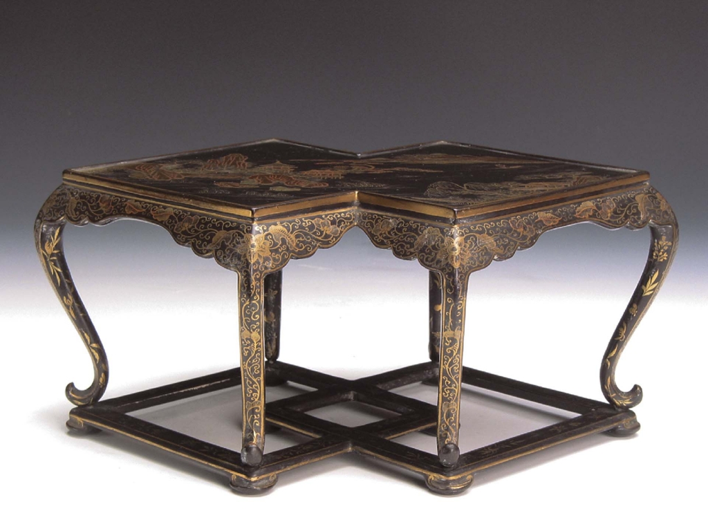 高14公分,長29.3公分。(圖12)方勝式香几。木質,通體髹黑漆,几面繪以描金圖案,邊緣部分隨形起一道攔水線,面上以「彩金像」法描繪山水圖案,山光水色,高塔亭榭,雜樹叢茂,江上帆影。几面背部描金折枝花果。几腿部呈弧形內斂,腿面描金纏枝花紋,足下承方勝形托泥,其上亦描花卉。
