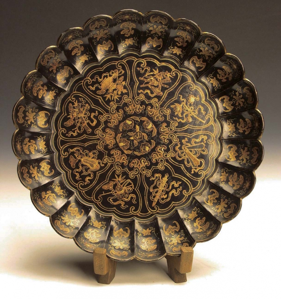 清〈黑漆描金菊瓣盤〉