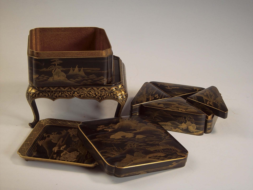 高12公分,盒徑13.2公分。(圖8)套盒方形委角,由方盤一件、方盒及蓋、內套四個等腰直角三角形盒形成的攢盒共同組成,可拆卸可組合。盒均子母口,直壁,平底。盒內紅漆,外通體黑漆地上描金山水圖案,以敷色的濃淡體現山水、屋舍、植物的明暗對比關係。方盤邊緣飾描金回紋。底座呈方几形,几面內陷用以承盒,牙條及足部皆描金花卉。整體造型別致,具有雍容華貴、金碧輝煌的宮廷氣息。