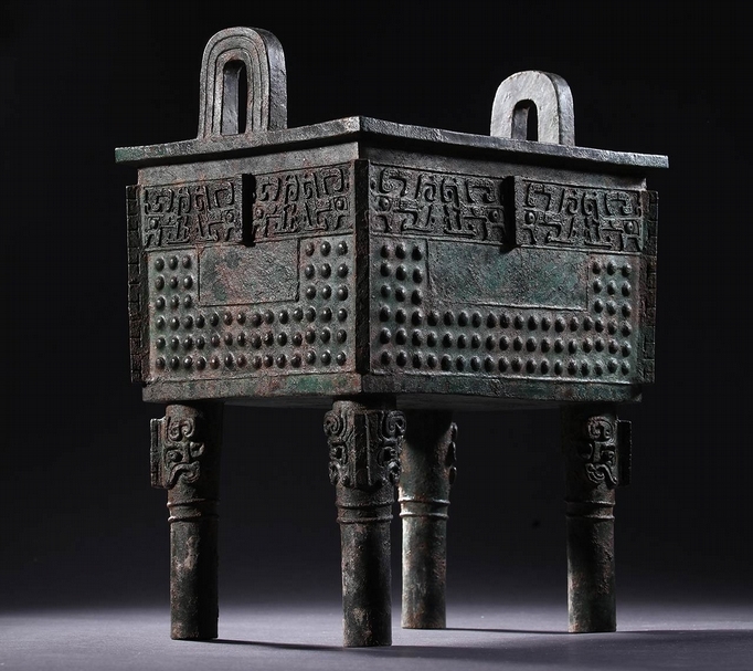 西周《青銅饕餮紋方鼎》,長26公分、寬20公分、高34公分,來源:日本關東實業家舊藏。此件方鼎呈長方形槽,折沿,方唇,兩短邊中部的口沿上直立雙耳,腰身下部略微內收,底面稍小於邊。鼎內壁鐫刻有銘文,腹壁兩側及下部遍佈乳釘紋,亦是商周青銅器常見的紋飾之一。鼎腹下承四足,為粗壯有力的圓柱形,在足根部皆有獸面形象,霸氣卻又十分精緻。(日本美協拍賣提供)