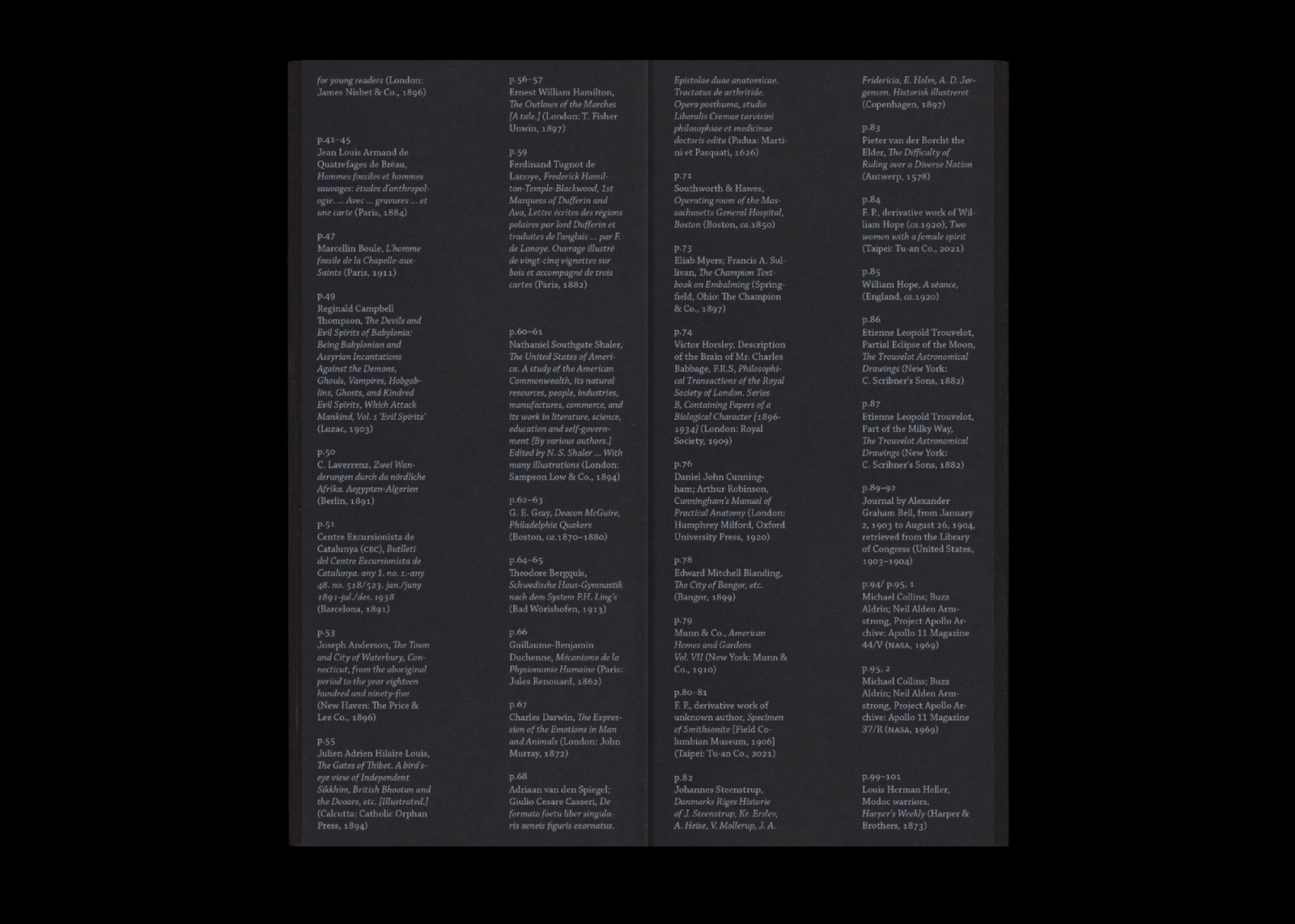 審視著《物》紙張的金邊,再翻開晨紙黑所乘載的內容,從顯微鏡下的微觀切片、轉移到天文球體圖像的算式、宇宙的星辰陣列、珍稀奇獸的凝視、人體病理的解剖圖示、古教堂建築的建築平面圖等,人類的文明在銀、白、亮黑、霧黑、金間閃爍。