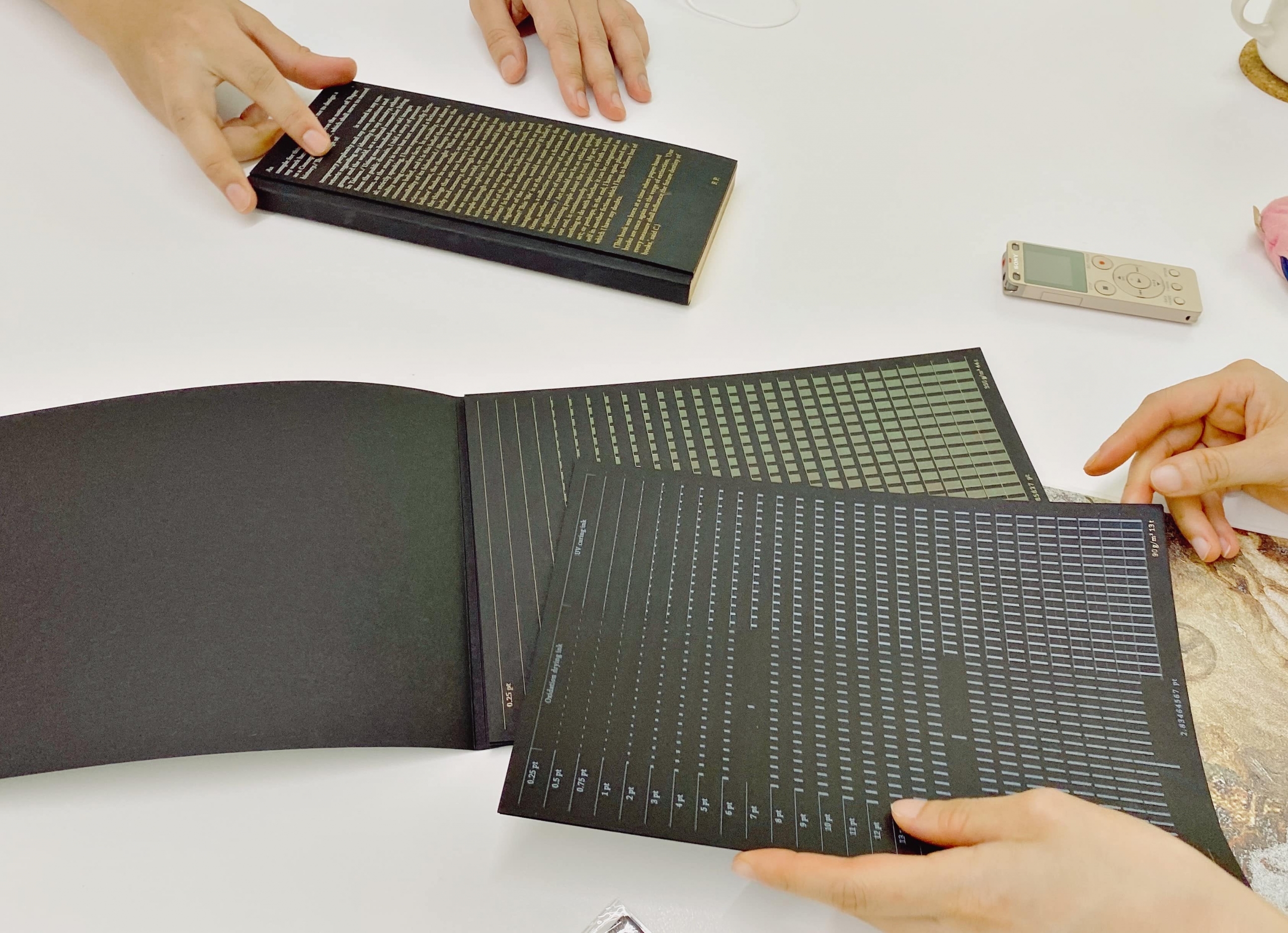 通常一般商業通路的書籍印製,多是以白紙為基底,以全黑底為主的裝幀對於設計師、印務、印刷廠都充滿考驗的細節。但為了更協助業界設計師與編輯、印務理解晨紙黑,圖案室也準備一份貼心的工具包,將能在晨紙黑顯現使用的技法都細緻統整、示範出來。