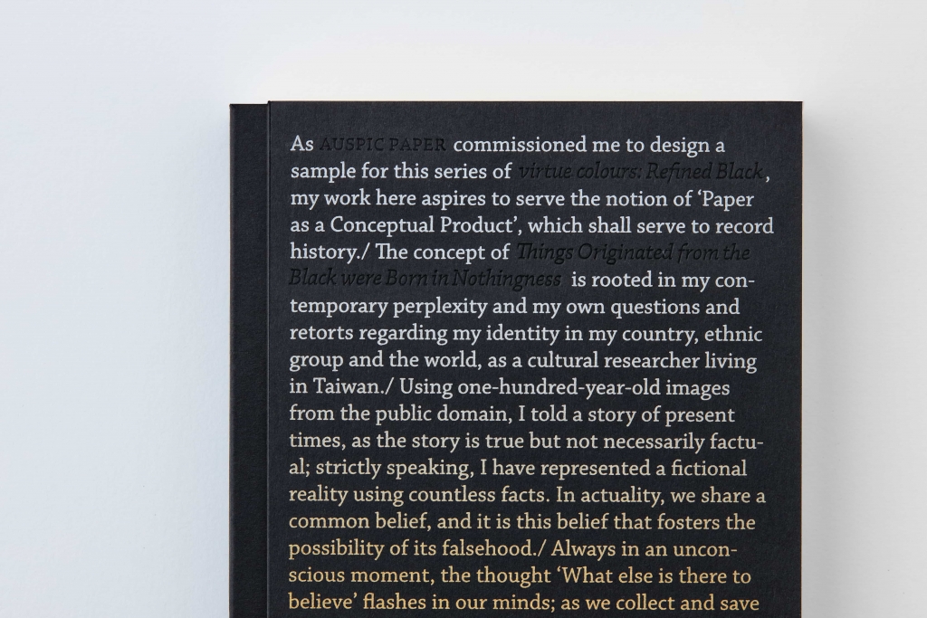 恆成紙業主理人鄭宗杰表示,「設計師期待最終的成品,是會給想要用這張紙的人一種啟發。」過於明確、指向性的設計,反而可能會限制這張紙材被應用的想像,最終《物》以「書」的形體現身,在黑色的碑體裡,層疊、延展了無數的印刷加工的技法。 《物》是立於非教案的方式給予使用者,「只能」怎麼使用的規範。比較像是容器般,提供一種啟發給與選擇使用晨紙黑的人們,這張紙張的各種可能性,而非限制創造的發想,以迂迴、間接的方式展現晨紙黑的內蘊。