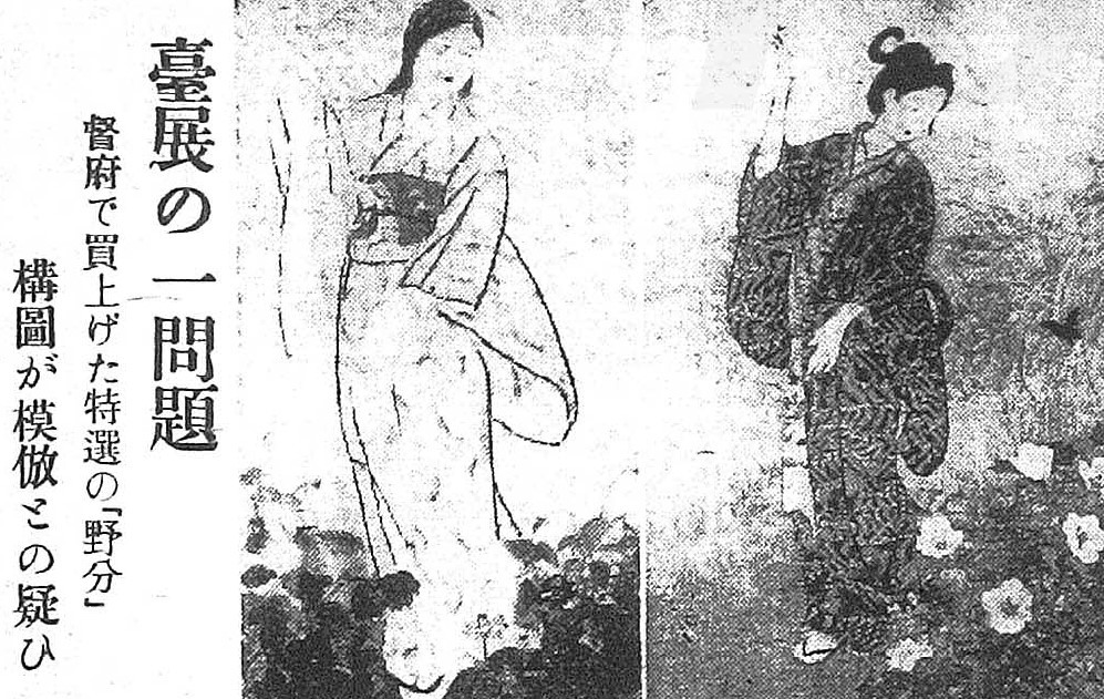 看到報紙說我的《野分》的姿勢模仿門井掬水,但這其實只是我在郊外,對所見景物的瞬間感受,並非模傲門井氏的作品。人物畫的構圖都很相似,我之所以被批評,可能是我的畫技不成熟、努力不充分所致。但即使姿勢相似,畫面表現仍全然不同。我為了表現「野分(秋風吹過、草木紛亂)」的感覺,煞費苦心,比起古代風俗,我更偏向表現現代風的美人畫。仰賴大家的庇蔭,臺灣的美術一年比一年興盛,令人欣喜(後略)。