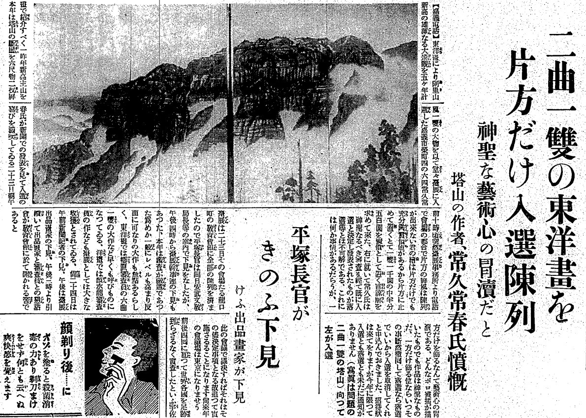 〈二曲一雙の東洋畫を 片方だけ入選陳列 神聖な藝術心の冐瀆だと 塔山の作者、常久常春氏憤慨〉,《臺灣日日新報》,1934-10-24(版7)。