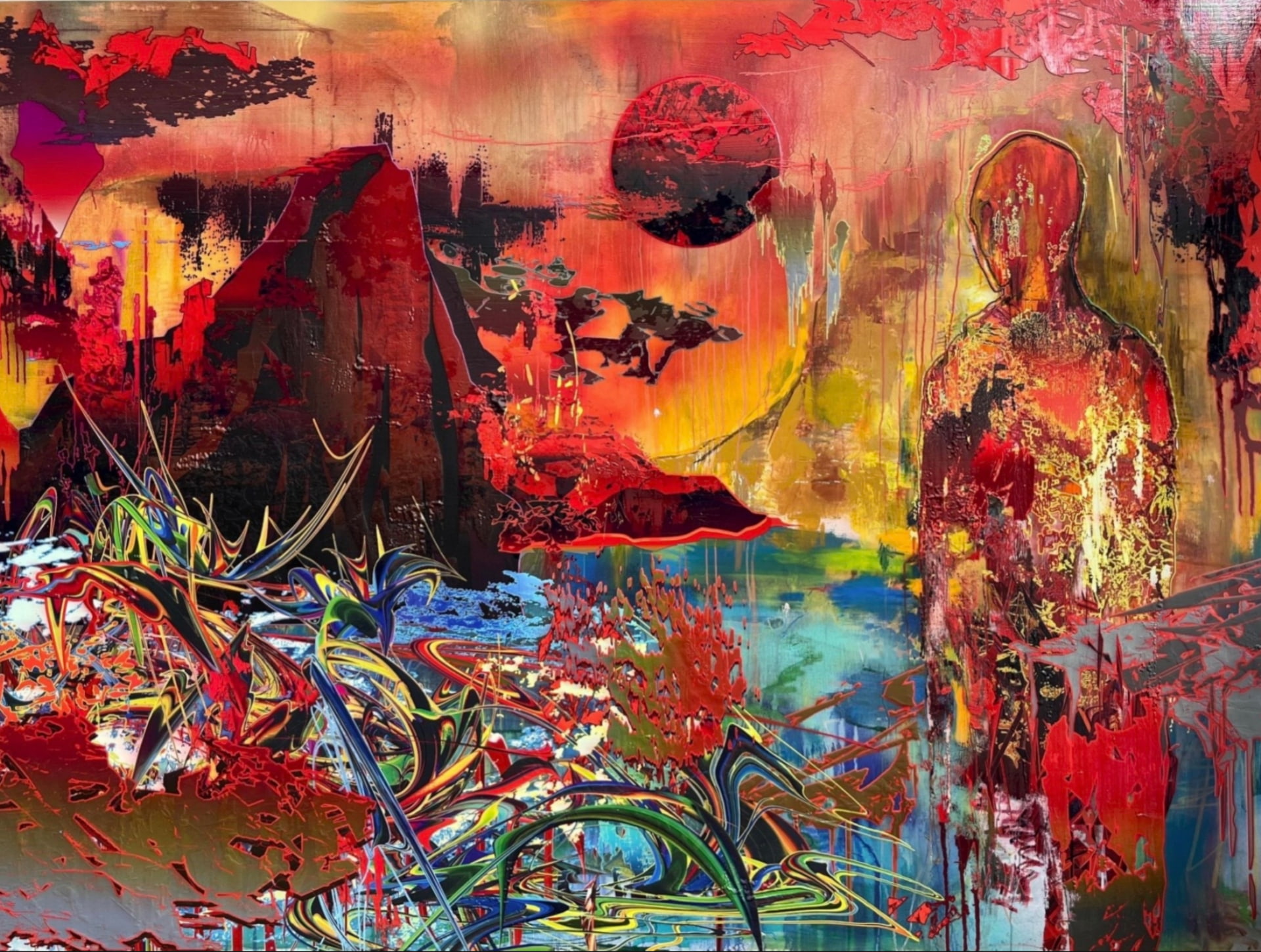在這個畫面中,有不少輪廓線與點狀的圖像,藝術家都將其描繪得像是由像素粒子與類比訊號所組成的那般。左下角介於書寫與塗鴉造形之間的繽紛多彩的錯綜線條像是這個賽博格世界的霧,帶起了視覺延伸的作用,與人物、圓月、山景之間形成視線的迴圈。