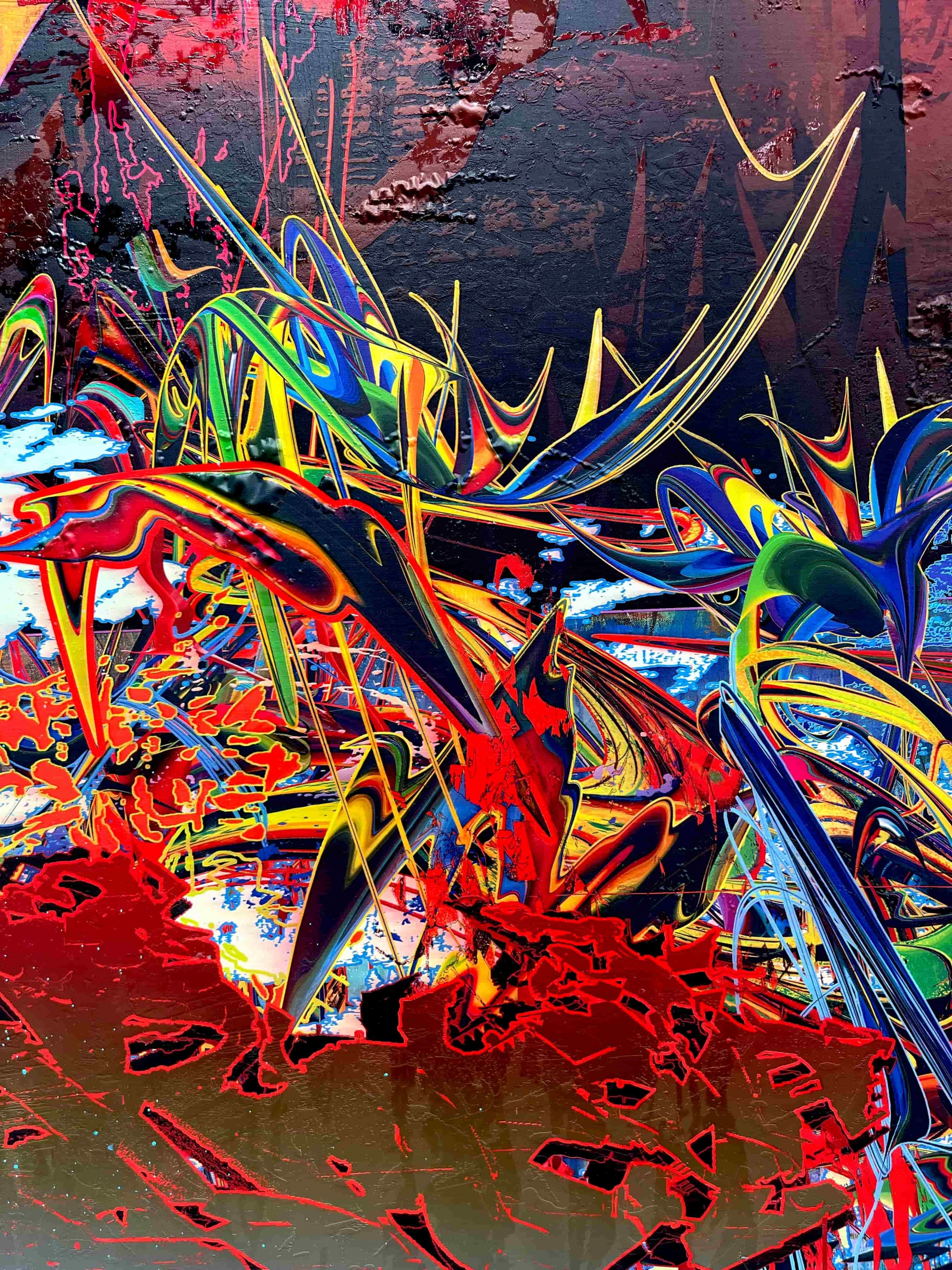 細看那些充滿速度感的迴旋,與條狀色彩的表現的力道,並不真的表現那些在塗鴉客、書法家或表現主義畫家的創作中經常出現的「體現(embody)自我表現的筆觸」,蘊藏在製圖工序中的,更像是多種生命集結起來的賽博格,層層組裝機械性與有機性。如中西伶這般的視覺藝術創作,蘊含著這個時代特有的數位極繁主義。