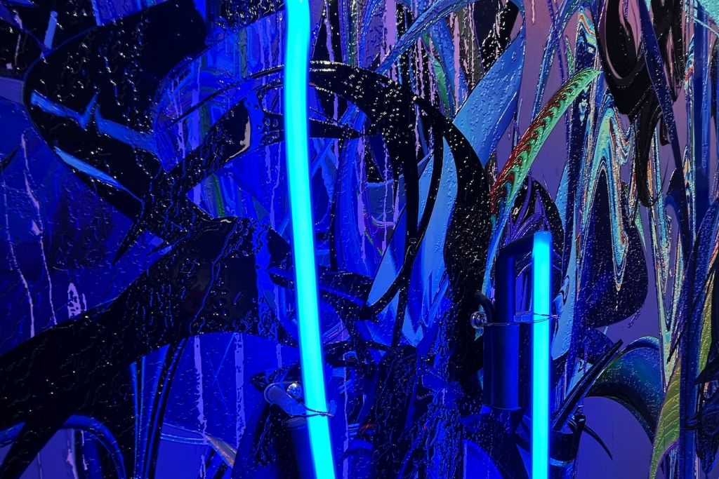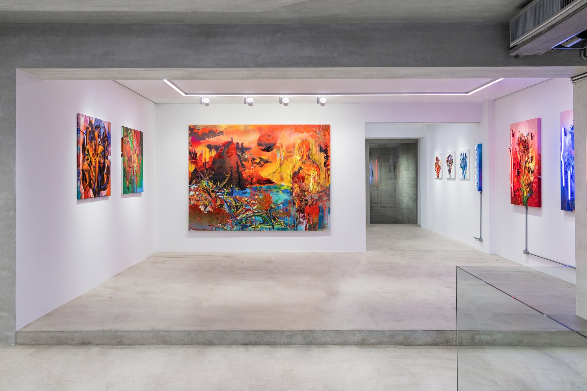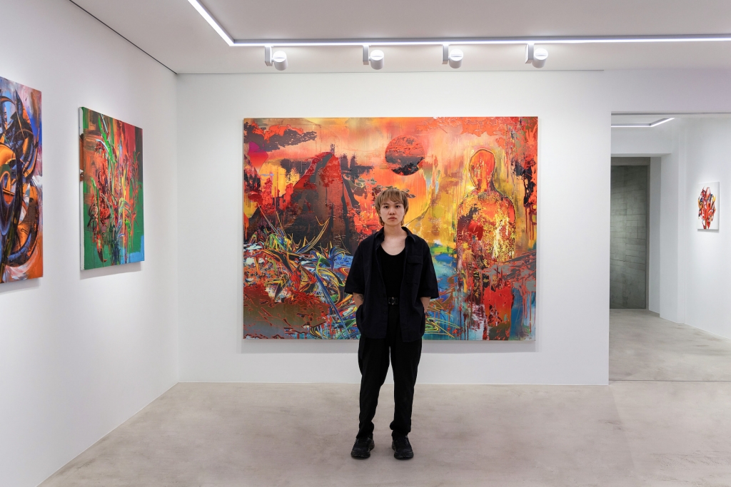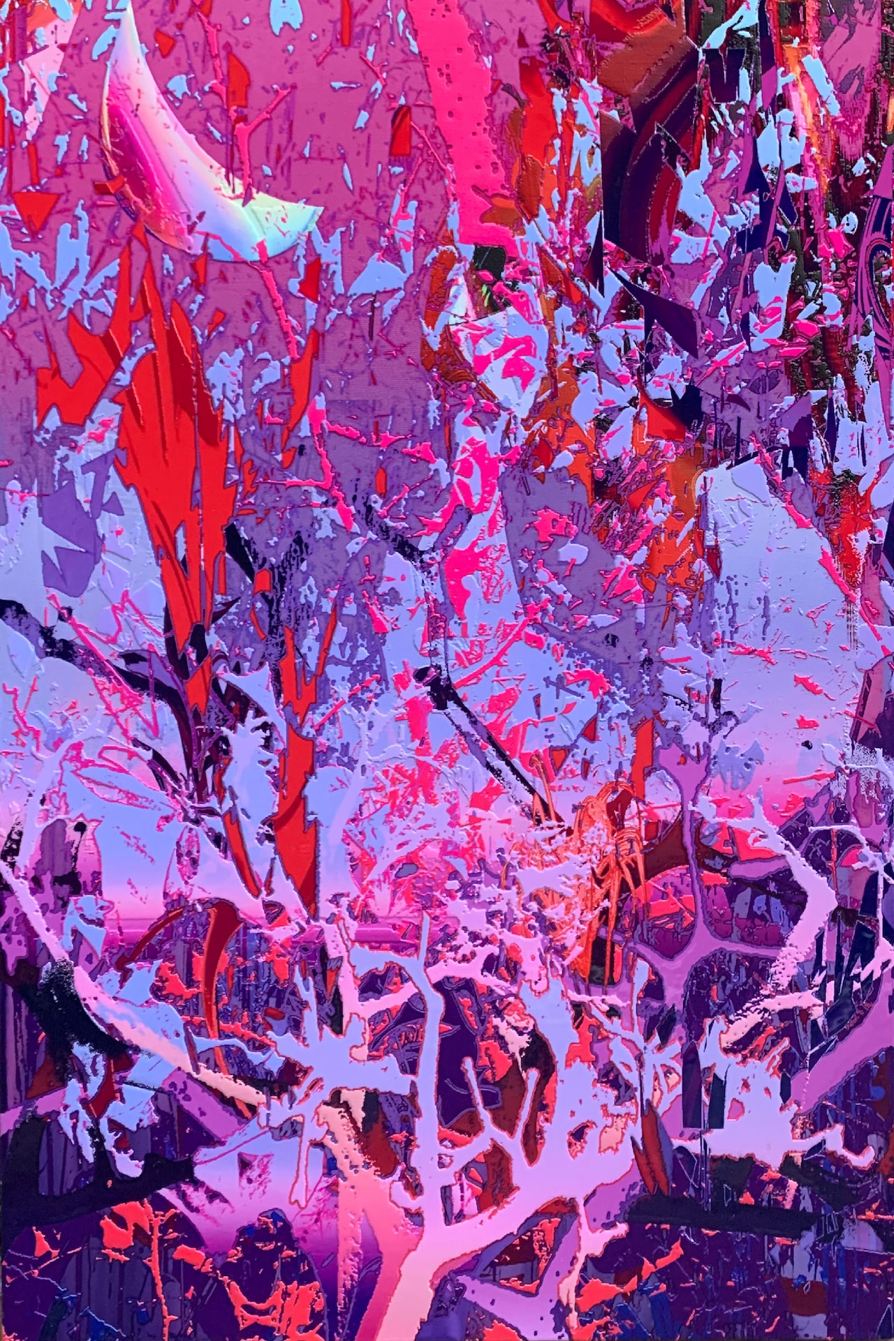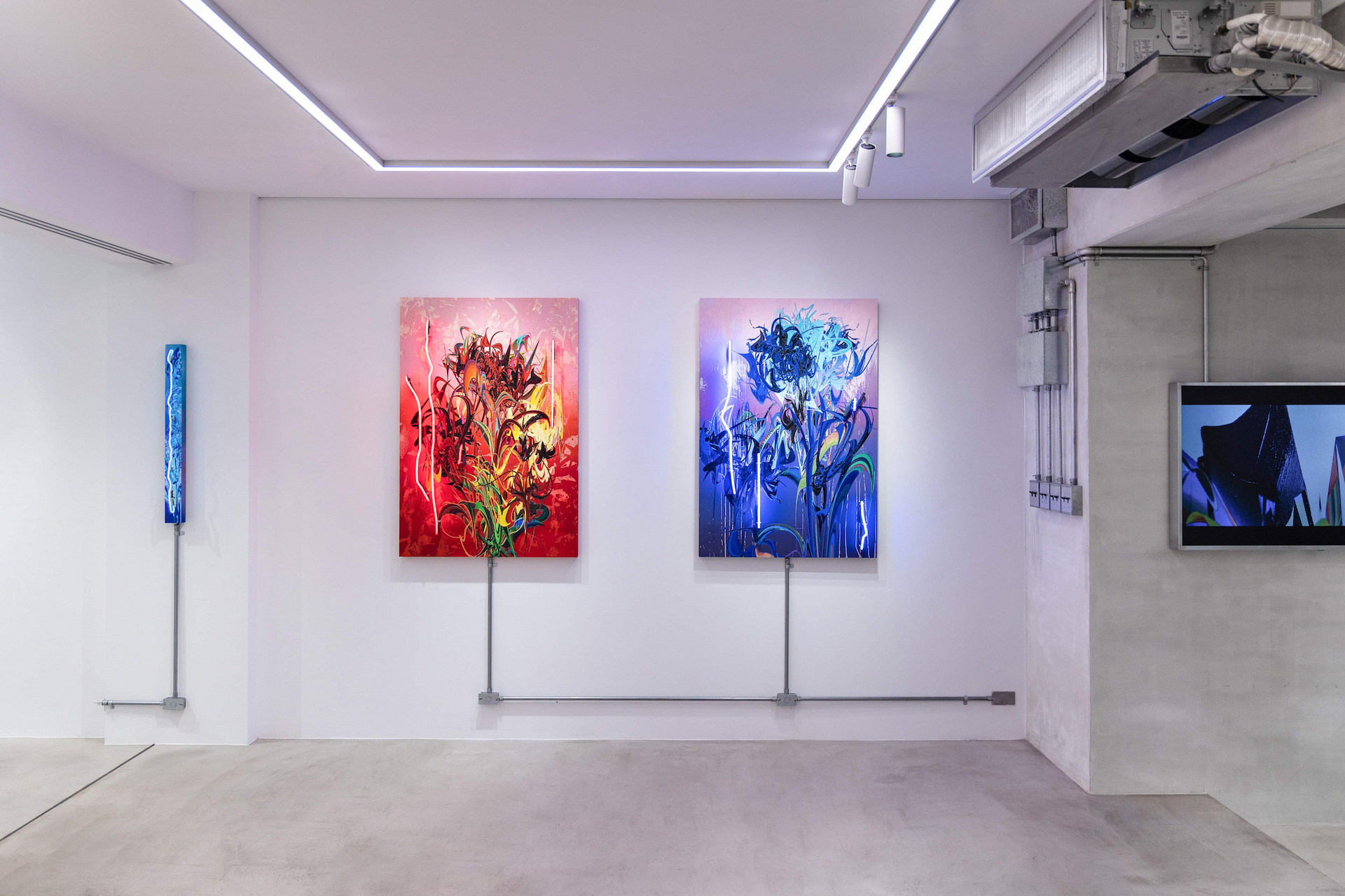 那是一個個由高彩度與高明度的壓克力顏料所建構的液態圖形。畫布上鮮明的漸層色彩與撞色顏料塗抹得像是迴旋的刀刃,綻開一朵生命力過於銳利的花朵,銳利到讓人覺得它是一種非自然的生命力表現,尚殘留些許酸性的視覺美感。