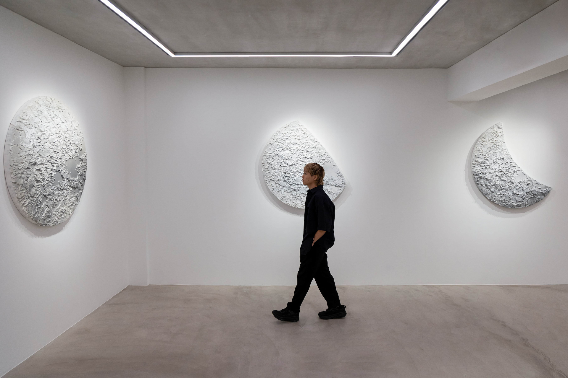 在這裡的整體與平衡感,與一樓的繪畫作品有些不同。新系列的月型作品更像是在作品與作品之間連結的時序,進一步藉著裝置方法表現同一意象在不同造形中表現時間與運動的循環。此時的月對中西伶來說,更像是一個投射與表現的屏面,映照藝術家對月的想像,並顯現在作品完成之後的命名裡。