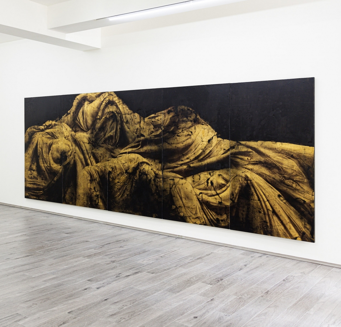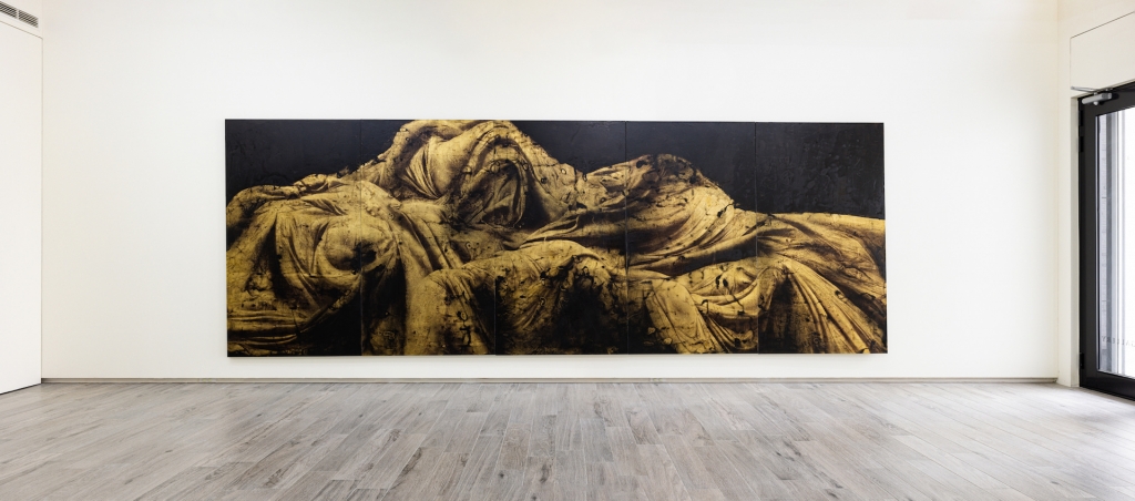 「一次旅行時意外見到一座雕塑《蒙紗的基督》,輕柔的薄紗幾乎陷入基督的肌膚表面,好像隨時都能被一陣風掀起。若基督蒙紗是為了神性的隱藏,「聖傷」則是關於人性的張揚,以輕紗、布幔覆蓋在若有似無的身體之上,皺褶成為欲望的伏流,軀幹則交錯堆疊成連綿山巒。」
