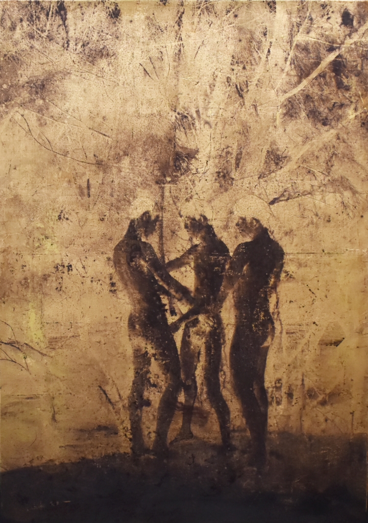 《暗湧》有著與克林姆(Gustav Klimt,1862-1918)、日本琳派繪畫不同的金色浪漫。在《暗湧43》裡的三位男子,在暗處的叢林中裸露,相互碰觸彼此如雕像般墨皮銅骨的纖細身體。他們是屬於這個時代的「美惠三女神」(Kharites)。我忍不住想起那些以希臘羅馬神話之名、委託畫家畫下青春少年少女胴體的精彩繪畫——不論在天上或是人間,祂們總是裸體。唯一的差別,是後者不用擔心危害善良風俗,也不因性向而遭受批評,祂們只存在於想像之中,而前者行徑則被視為越過道德的邊境。