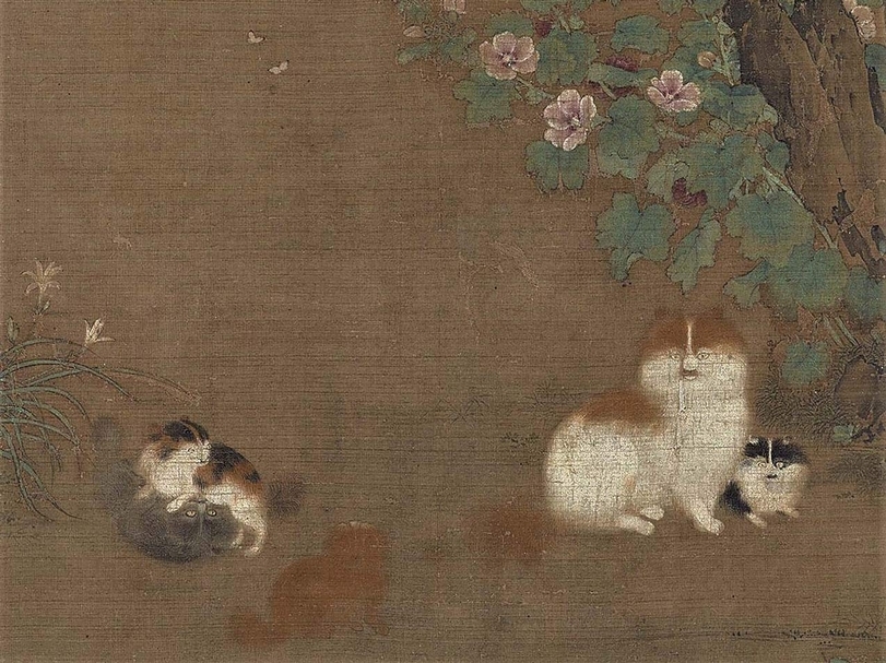 〈蜀葵遊貓圖〉係於太湖石及蜀葵下方描繪出長毛品種的成貓和四隻幼貓,另於空中繪有二隻白粉蝶。貓兒的毛髮全以細膩的線條仔細描繪,後方蜀葵的每片花瓣及葉片之表裡則以施加濃淡深淺的手法來表現立體感。〈萱草遊狗圖〉繪有太湖石、萱草及一隻成犬和四隻幼犬,可看出其與〈蜀葵遊貓圖〉於構圖及主題之對稱性。狗兒毛皮的表現以墨線為主體,再精心疊加白色顏料。後方萱草附近出於補絹補筆的錯落線條則略顯引人注目。