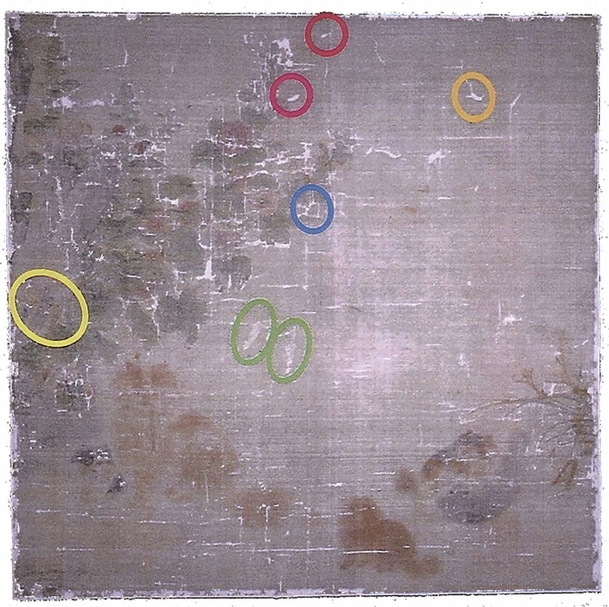 圖5 經透射光觀察之〈萱草遊狗圖〉背面(圓圈內為蟲蛀痕)。日本岡墨光堂提供。