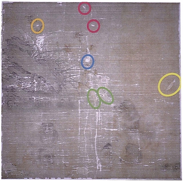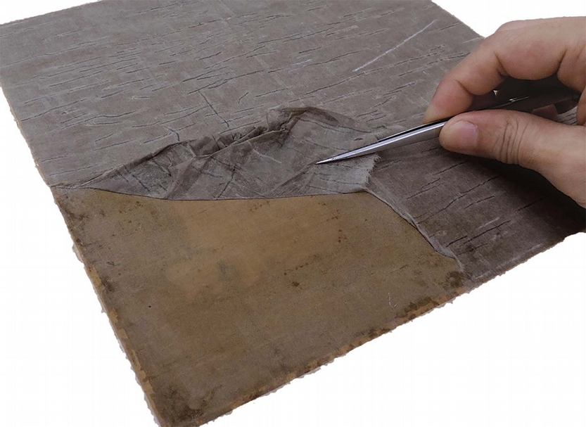 舊補修絹乃各別施加於主要料絹闕失之處,另外還出現在「平織絹」此一被視為用來修補散布之細小闕失處的背面整體(圖3)。