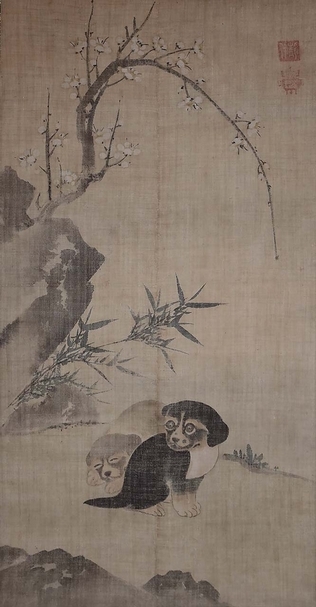 除此之外,右幅狗兒的圖樣至江戶時代後期亦為各色畫家所採納。比方說,狩野養信(1796~1846)摹自室町時代畫家等春的〈犬圖〉(東京國立博物館藏),即與本圖之圖樣大抵相同。該幅等春的畫作原被視為北宋徽宗的作品,後流傳至京都本國寺。又或是在致力於學習中國畫的伊藤若冲(1716~1800)之〈厖兒戲帚圖〉(京都鹿苑寺藏)中,亦能發現相同的主題。由此可看出這一連串作品無論傳承自李迪或徽宗,此類狗兒的圖樣都被視為中國樣式,正因如此才受到許多畫家積極地吸收、採用。可以說,在毛益系統的畫犬形象之外,本作對於探究日本所接受的中國樣式畫犬形象之多樣性上,誠為重要的作品。