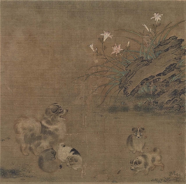 本圖的動物親子、太湖石及植物等,乃繼承了南宋院畫中動物畫之特定主題。又圖中配置了多樣昆蟲,亦具有草蟲畫之特性,可見到不囿限於往昔遊狗圖的各種要素。可以說,本畫對於探究南宋小畫面吉祥動物畫如何為明代大幅畫所繼承發展,誠為相當重要的作品。