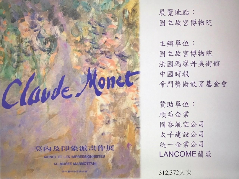 國立故宮博物院(簡稱故宮)和法國博物館的首次合作始於1993年,隷屬於蘭西學院(Institute de France)以收藏印象派大師克勞德.莫內(Claude Monet)作品聞名的瑪蒙丹美術館(Musée Marmonttan)以「莫內及印象派畫作展」開啟了台灣藝術愛好者的印象與視野,更加深了觀眾對莫內在法國北方故居吉維尼花園(jardin de Giverny)時期創作的了解。此展亦樹立了往後故宮籌劃國際特展時,與民間媒體集團及金融等機構的合作模式。