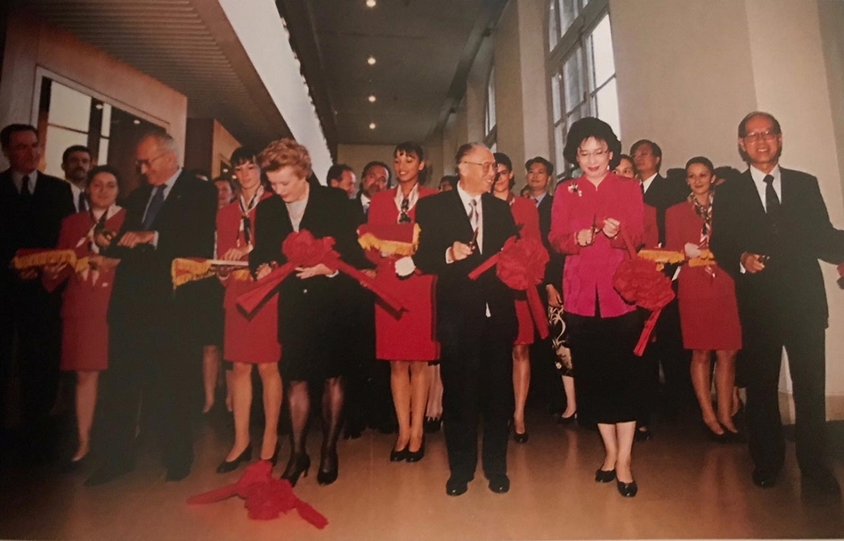 法國文化部暨通訊部長凱瑟琳.特勞特曼(Catherine Trautmann,左五)代表法方出席「帝國的回憶」特展開幕;台灣代表,右一起:時任郭為藩大使、時任林澄枝主委、時任秦孝儀院長。(陸仲雁提供)