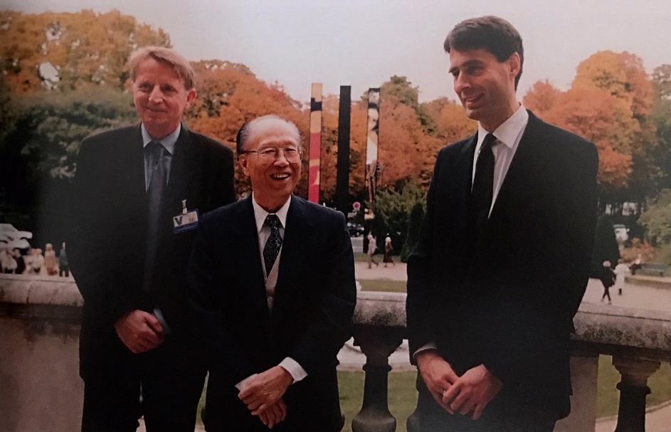 法國國立吉美亞洲藝術博物館館長賈立基(Jean-François Jarrige,左一)與時任故宮院長秦孝儀及大皇宮展覽總監(右一)於大皇宮合影。(陸仲雁提供)