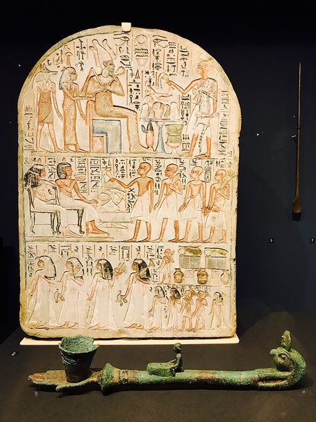 此為第十九王朝早期,約西元前1250年,可能來自埃及阿拜多斯的石碑。畫面最下方為逝者凱與妻子奈節姆珮荷瑞,正接受兒子奉獻的供品。在石碑畫面上一位身著豹紋者是祭司,正準備祭祀三位神祇俄賽里斯、西方女神和狼頭人身的安努畢斯。前面的青銅器則是香爐,主要是燃燒花或葉等植物,透過香氣的散發,使神祇環繞在愉悅的氣氛中。