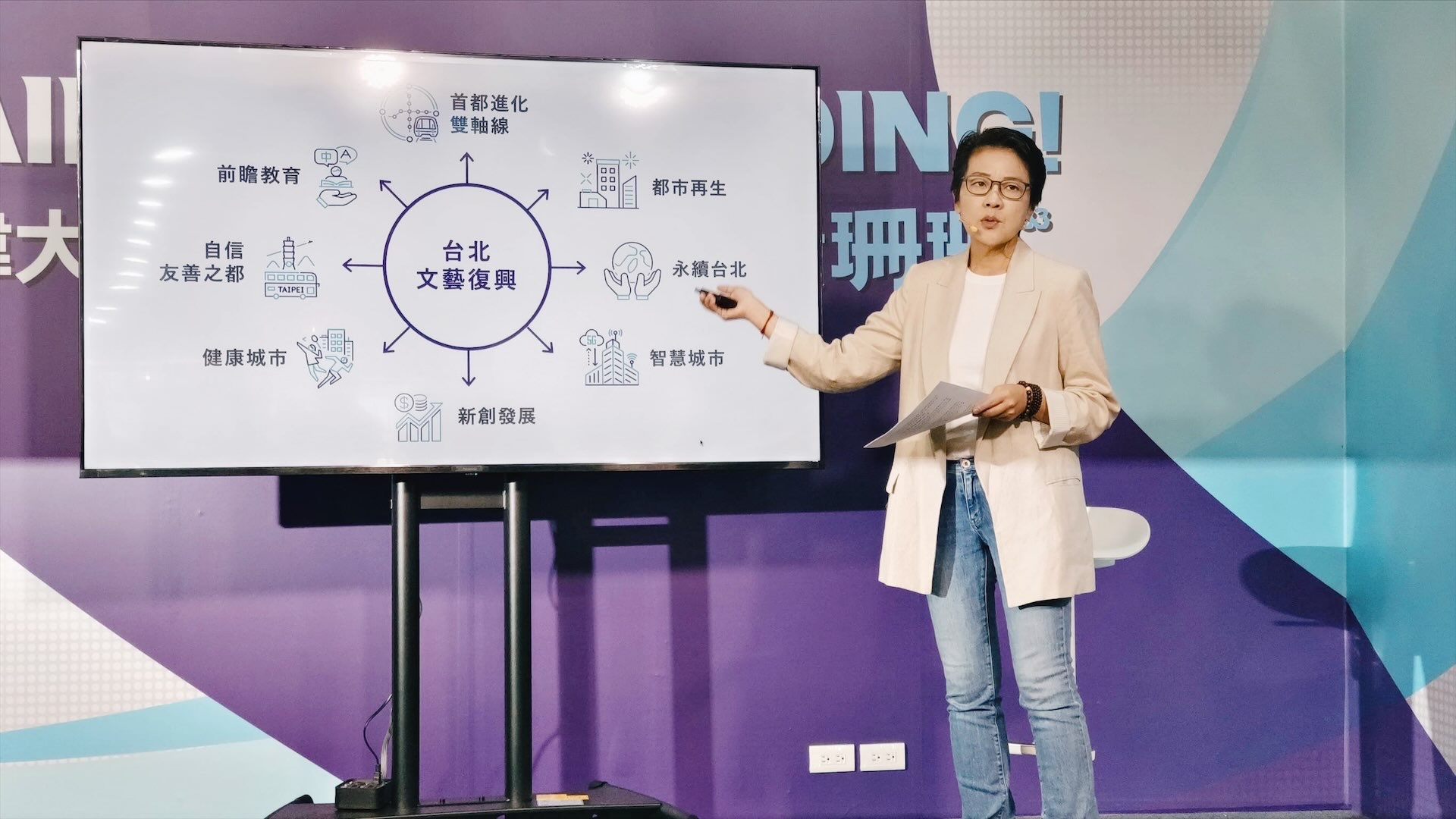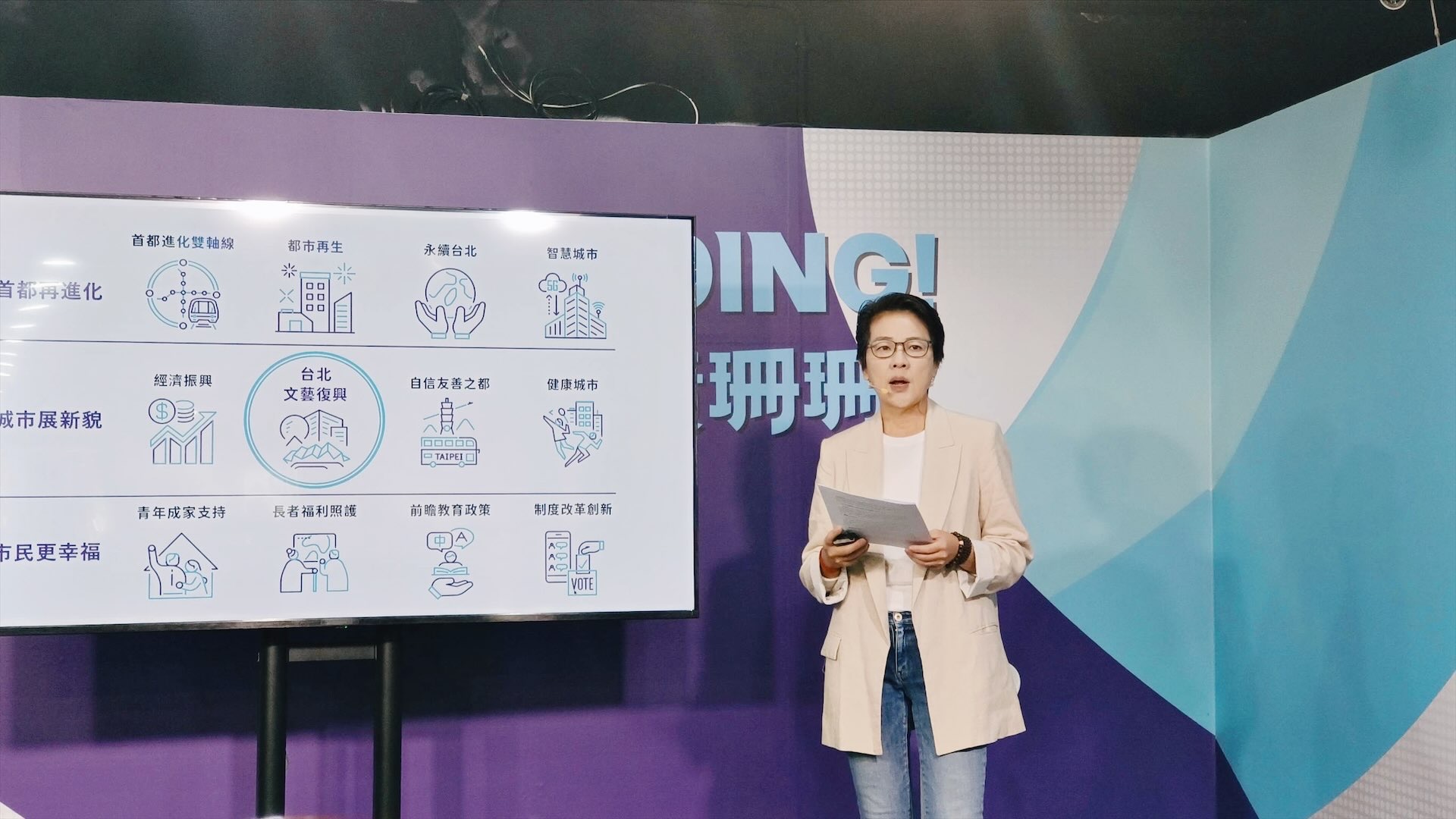 在黃珊珊的文化政見裡,「文藝復興專案辦公室」是一項重要亮點,她表示,若當選台北市長,將比照「城市美學專案辦公室」的設置模式,以直屬市政府之下的彈性任務編組,快速有效率以「一站式服務」來研發整合推動資源的整合和公私部門之間的對接媒合。