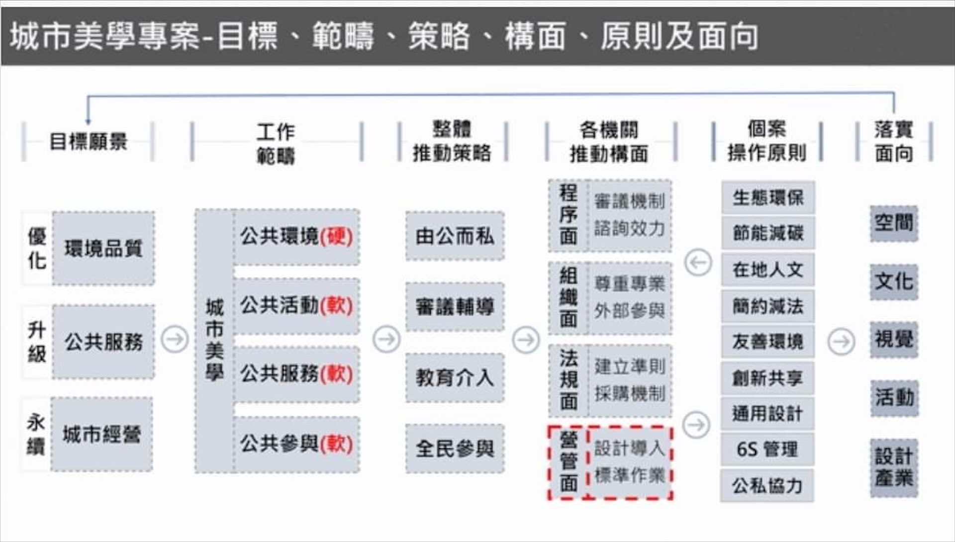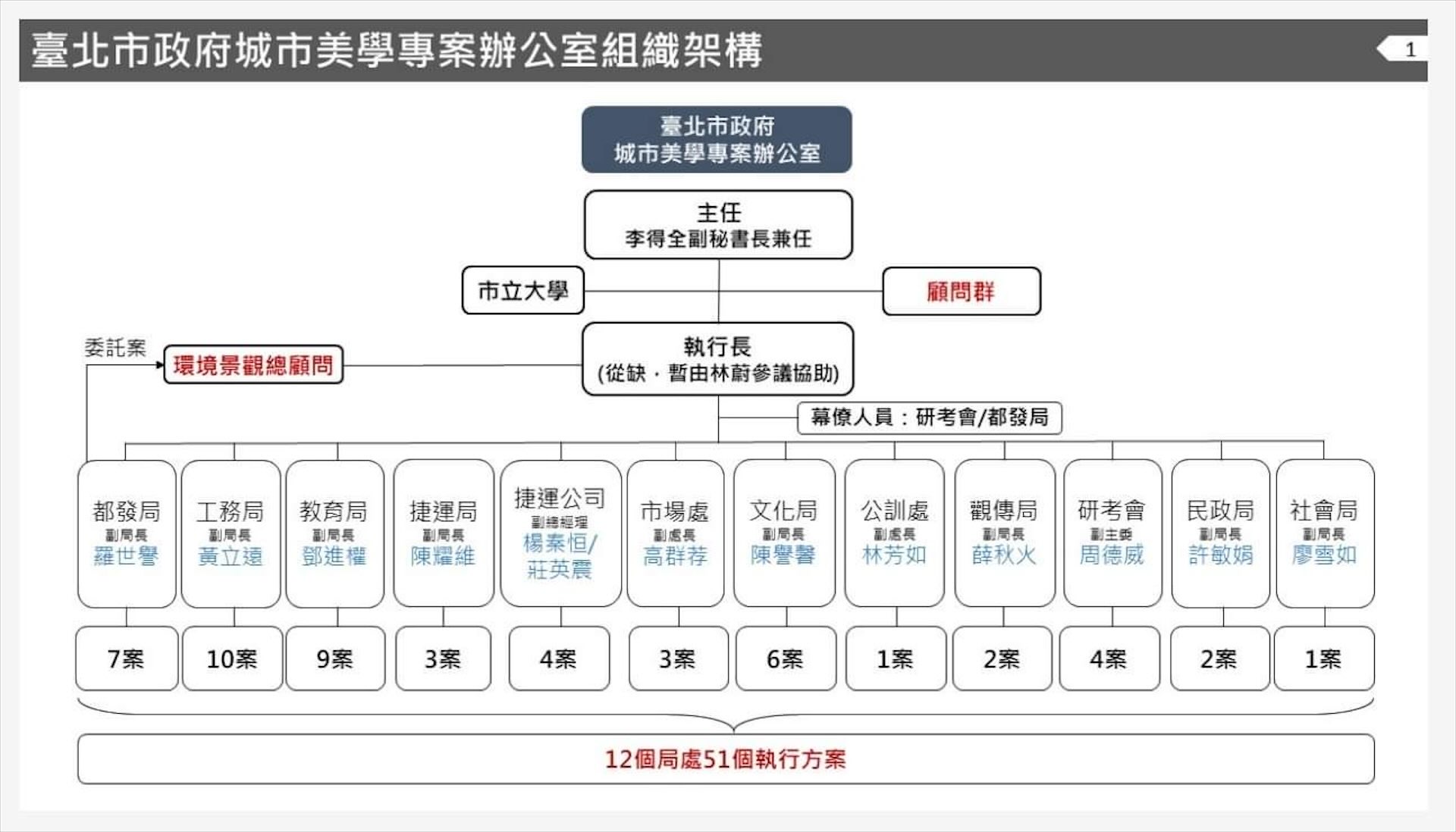 回看「城市美學專案辦公室」的組織圖和執行中的「跨12局處51個計畫」,會發現若將來「文藝復興專案辦公室」要上路執行,它勢將需要有更為高層級的授權機制,也需要重新檢討和「城市美學專案辦公室」有部分任務重疊或產生疊床架屋的組織釐清。