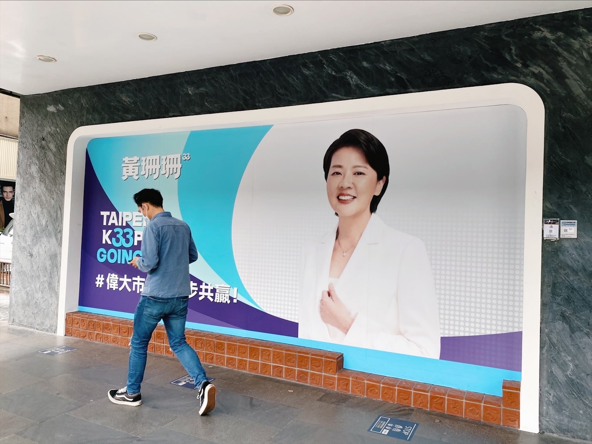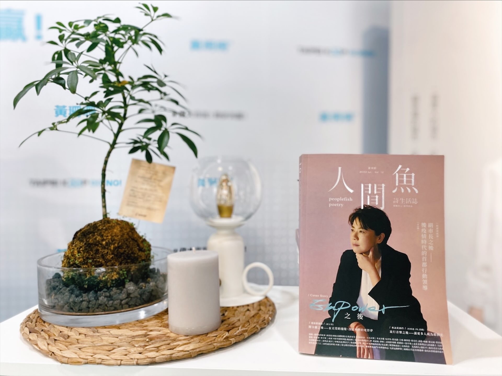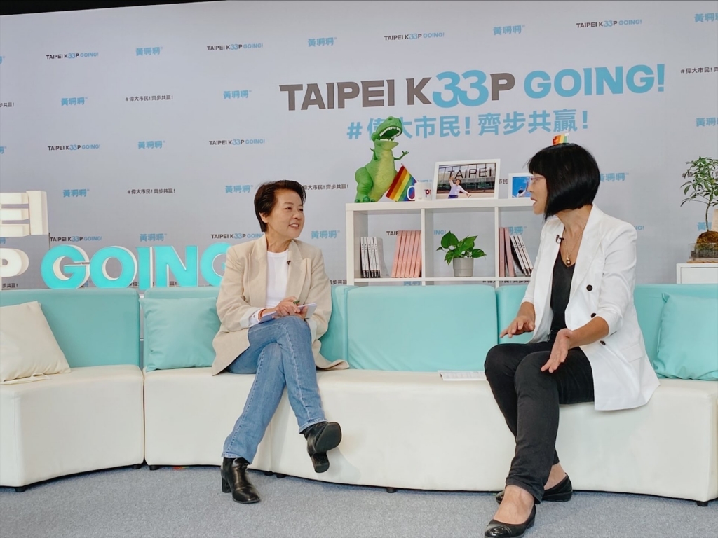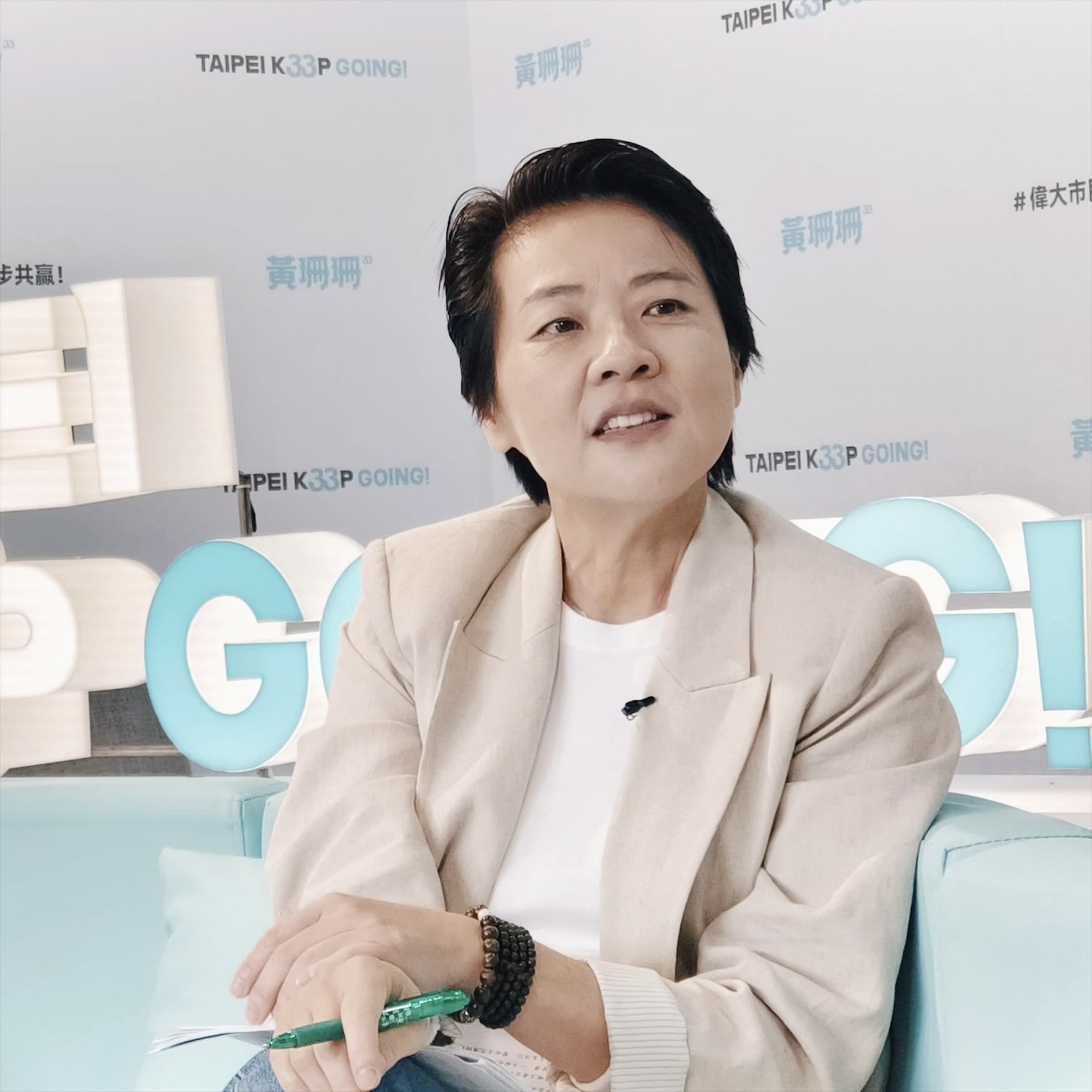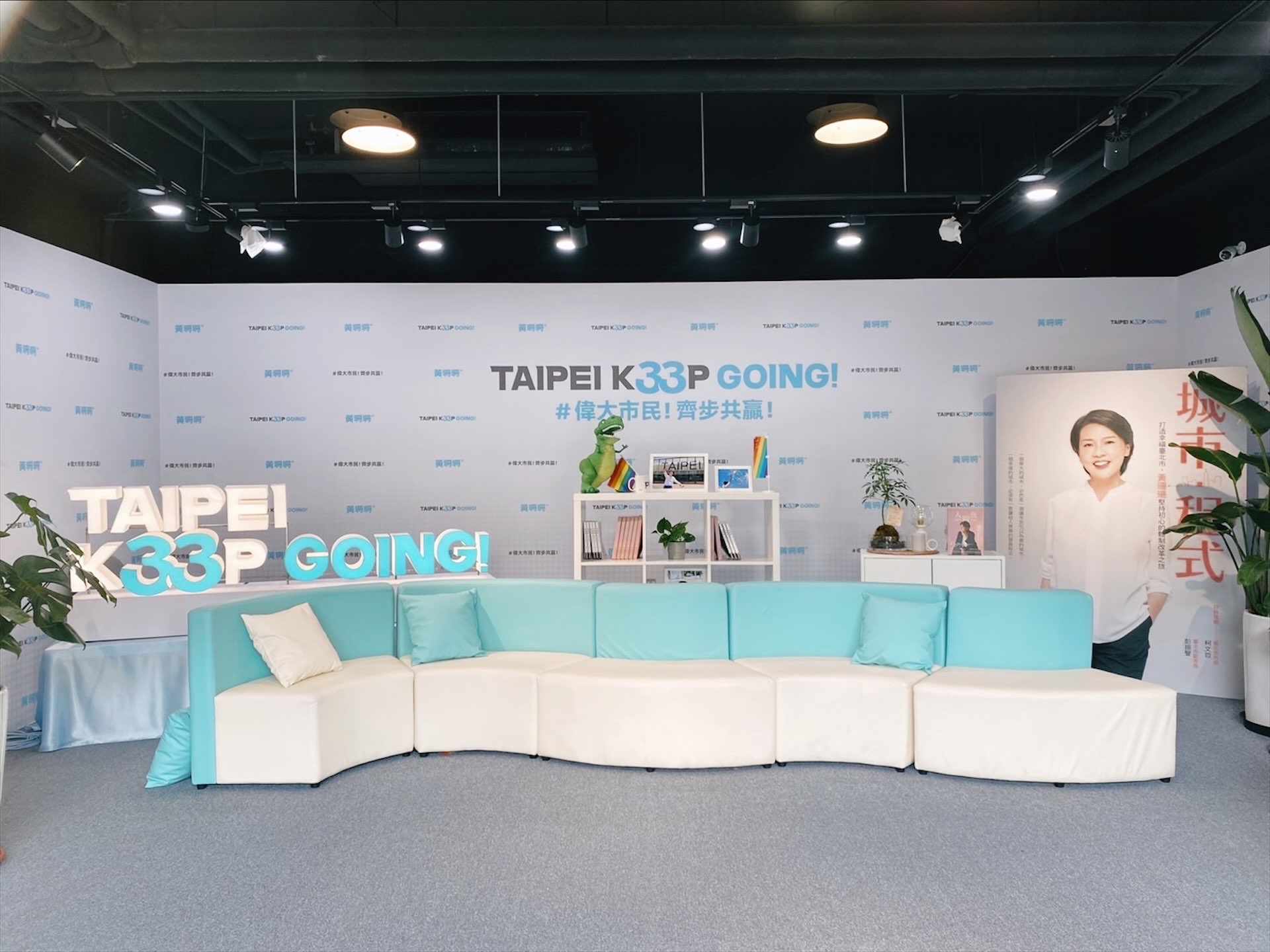 座落在即將完工的大巨蛋斜對面,台北市長候選人黃珊珊競選辦公室的會客廳佈置地像一間清新的直播間。直面騎樓的透明大片玻璃窗,旁邊的層架擺放著競選團隊的文創小物,以及黃珊珊走訪台北市各地時的攝影,後面的書櫃上放著兩本書,一本是自傳,一本是黃珊珊作為封面人物的文化生活雜誌。競選總部清亮透明的設計氛圍,反應著黃珊珊希望讓經過這裡的人認識自己的視角。
