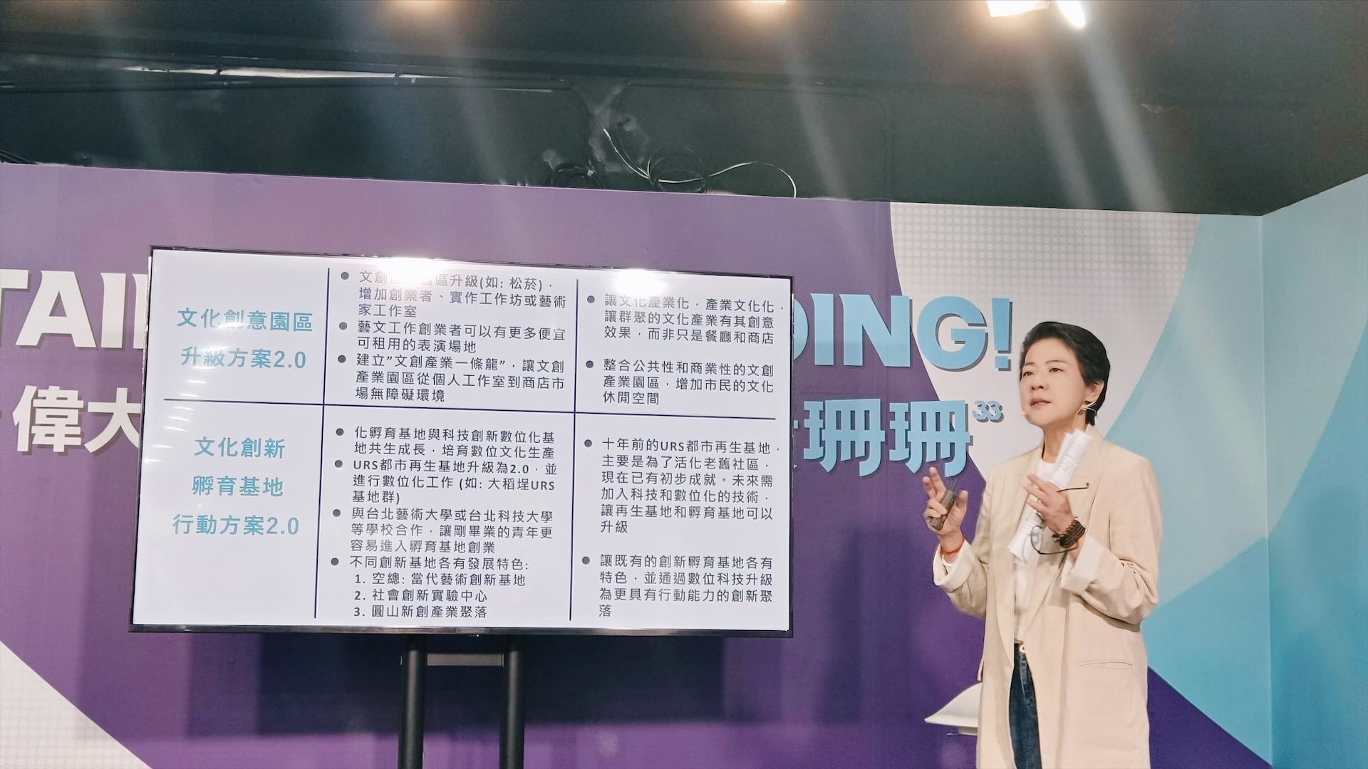 她並強調在文化政策應重視的是規劃內涵,「提高預算是相對的必然結果,但單純提高預算卻沒有明確規劃,可能造成資源的錯置與浪費。」