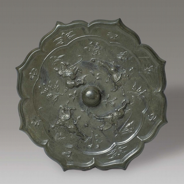 圖7 唐〈打馬球銅鏡〉,直徑18.5公分、厚1公分,1965年揚州市邗江縣泰安鄉金灣壩工地出土。菱花形的鏡身,背面是四名騎士,手執鞠杖,姿態各異,躍馬擊球的紋飾。主紋飾襯以高山、花草,展現了一幅唐代郊外打馬球比賽的情景。馬球運動源於波斯,漢代傳入中國,到了唐代此運動得到了皇帝和貴族的喜愛,成為社會主流運動項目,此銅鏡的畫面讓今人可一瞥千年前大唐盛世。(揚州博物館提供)