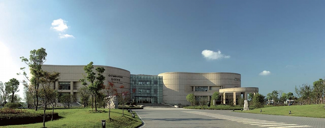 2005年10月落成開放的揚州雙博館(揚州中國雕版印刷博物館、揚州博物館新館)位於古城揚州新城西區,距老城區中心約7公里。館舍占地5萬700平方公尺,建築占地6000平方公尺,建築面積2500平方公尺,東西長148公尺,南北寬48公尺,簷高22.4公尺。建築為三層框架結構,其中展覽(含既是休息空間又是展示空間)面積9319.4平方公尺,中廳1144.2平方公尺,公共服務空間(含衛生間、走道等)6407.8平方公尺。館舍東南臨新城西區新開挖的明月湖,圓形湖面闊500公尺(圖1)。